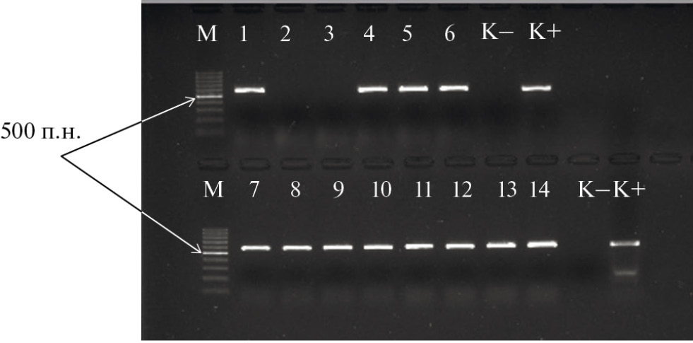 Рис. 1. Электрофореграмма продуктов амплификации, полученная с использованием праймеров TA51 F/TA52 R, специфичных для гена ToxА в изолятах Parastagonospora spp. из краснодарской популяции. Размер ампликона 573 п. н. М – ДНК маркер Gene Ruler 100bp (Thermo Fisher Scientific). Номера индексов соответствуют следующим изолятам: 1…6 – 95-23-1…6-P.ps; 7…14 – 86-23-1…8-P.n.; К+ – 29-21-P.n.; К- – 26-21-P.n.