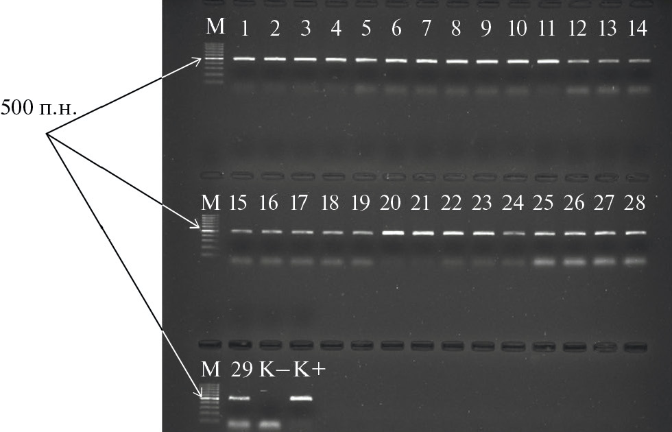 Рис. 2. Электрофореграмма продуктов амплификации, полученная с помощью праймеров SnTox1cF/SnTox1cR, специфичных для гена Tox1, в изолятах Parastagonospora spp. из краснодарской и ленинградской популяций. Размер ампликона 500 п. н. М – ДНК маркер Gene Ruler 100bp (Thermo Fisher Scientific). Номера индексов соответствуют следующим изолятам: 1…12 – 78-23-1…12-P.ps.; 13…17 – 79-23-2…6-P.ps.; 18…22 – 82-23-1…5-P.n.; 23 – 90-23-2-P.ps.; 24…25 – 90–23–4…5-P.ps.; 26 – 86-23-2-P.n.; 27…29 – 86-23-6…8-P.n; К+ – 32-21-P.n.; К- – 29-21-P.n.