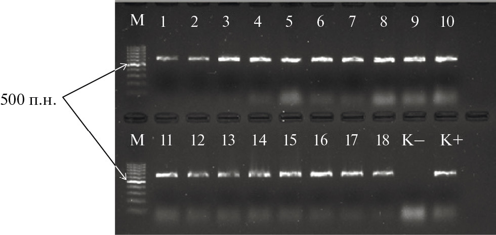 Рис. 3. Электрофореграмма продуктов амплификации, полученная с помощью праймеров SnTox3cF/SnTox3cR, специфичных для гена Tox3 в изолятах Parastagonospora nodorum из краснодарской и ленинградской популяций. Размер ампликона 600 п. н. М – ДНК маркер Gene Ruler 100bp (Thermo Fisher Scientific). Номера индексов соответствуют следующим изолятам: 1…10 – 79-23-1…10-P.n., 11…18 – 86-23-1…8-P.n. К+ – 29-21-P.n.; К- – 26-21-P.n.