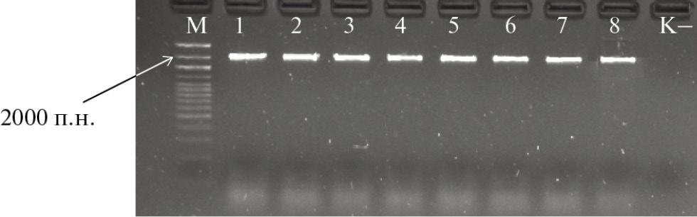 Рис. 4. Электрофореграмма продуктов амплификации, полученная с помощью праймеров SnTox2_DONR_F/ SnTox2_DON_RS, специфичных для гена Tox267 в изолятах Parastagonospora nodorum из краснодарской популяции. Размер ампликона 2000 п. н. М – ДНК маркер Step Long (Биолабмикс). Номера индексов соответствуют следующим изолятам: 1…8 – 86-23-1…8-P.n.