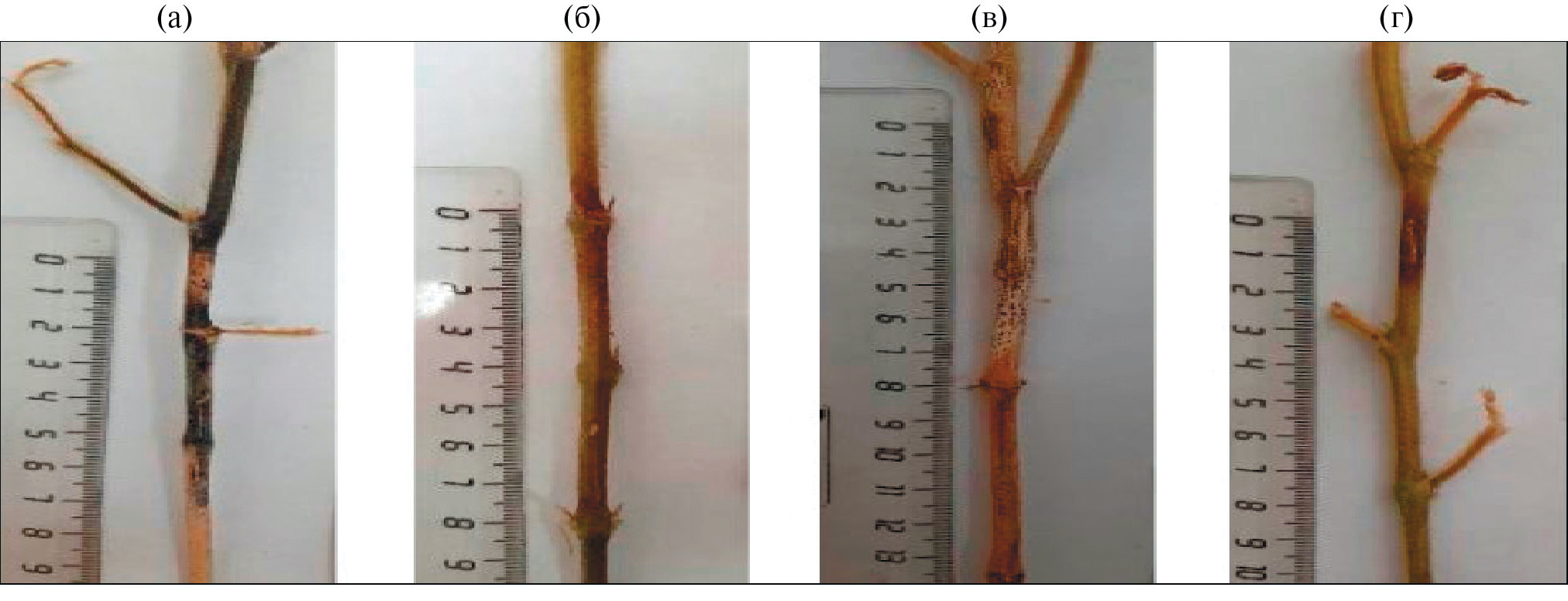 Рис. 2. Внешний вид стеблей сои после инокуляции на 40-е сутки: а) зараженный штаммом Diaporthe sp.-1; б) контроль; в) зараженный штаммом D. eres MF-Pm-5a; г) зараженный штаммом D. eres MF-Pm-4a.