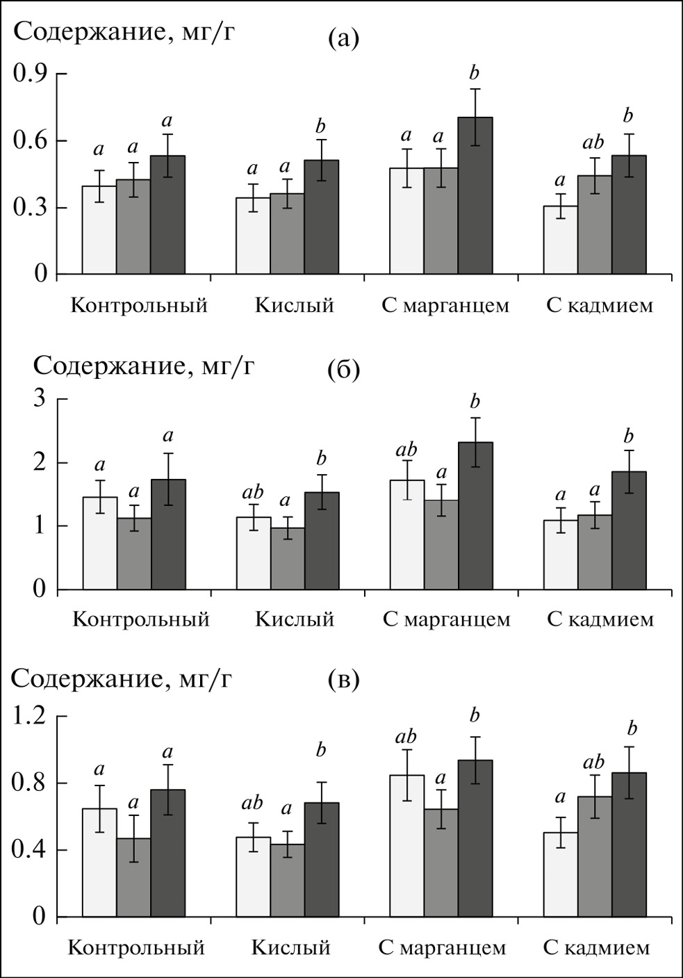 Контрольный (нейтральный) почвенный фон создавали путем внесения в природную сильнокислую почву (рН = 4,3) доломита из расчета 550 г/м2. Кислым фоном служила почва с природным уровнем кислотности (рН = 4,3). Фон с марганцем и кадмием создавали путем внесения в природную кислую почву соответственно водорастворимых солей марганца (MnSO4·5H2O) и кадмия (Cd(CH3COO)2·2Н2О), а также доломита из расчета 170 г/м2 для обеспечения оптимальных условий подвижности ионов металлов (рН = 5,2) (табл. 1). Использование на порядок более высокой концентрации марганца в рамках модельного эксперимента было обусловлено более низким классом опасности (3 класс), чем кадмия (1 класс) [27].
