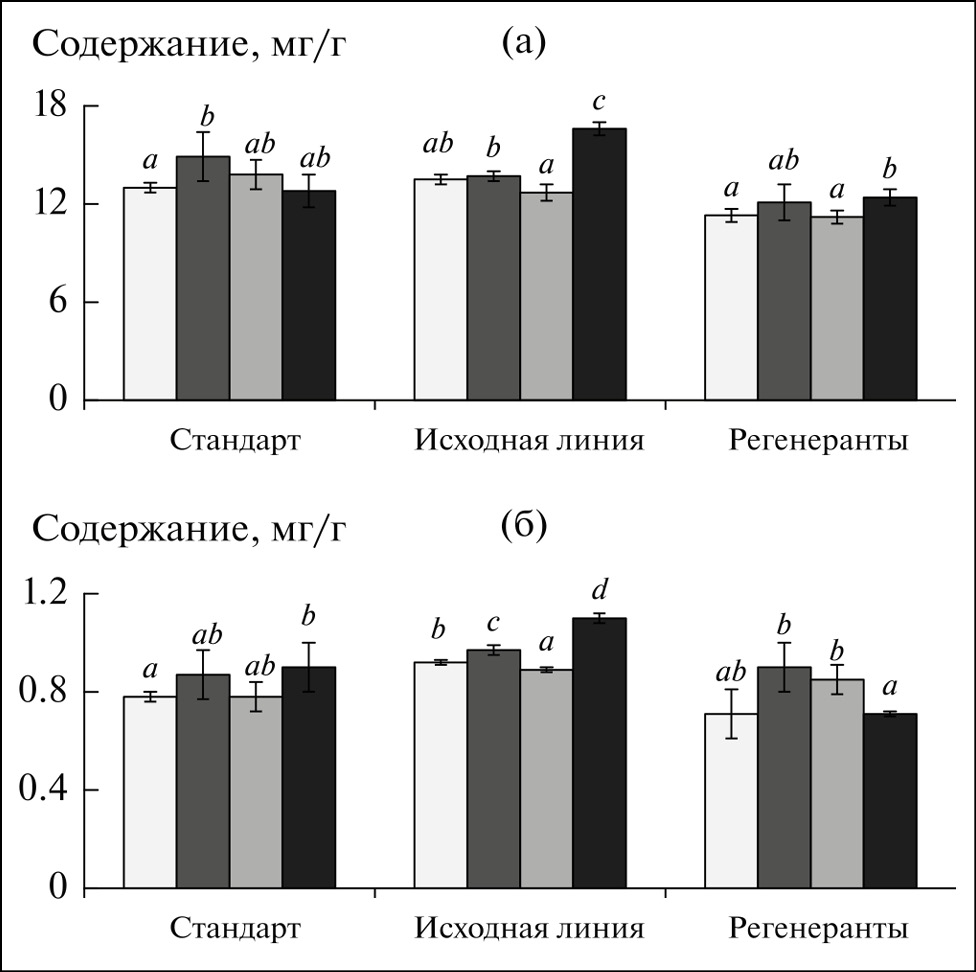 Регенеранты на стрессовых фонах достоверно превосходили исходную линию по содержанию основных пигментов в листьях: каротиноиды – RAAl в 1,4 раза (0,51 ± 0,09 мг/г сырой массы) и RAMn в 1,5 раз (0,71 ± 0,09 мг/г); хлорофилл а – RAAl в 1,6 раз (1,54 ± 0,28 мг/г), RAMn в 1,6 раз (2,32 ± 0,36 мг/г), RAСd в 1,6 раз (1,86 ± 0,34 мг/г); хлорофилл b – RAAl в 1,6 раз (0,68 ± 0,12 мг/г), RAMn в 1,5 раз (0,94 ± 0,14 мг/г). В контрольных условиях различия между RA и исходной линией были недостоверны.