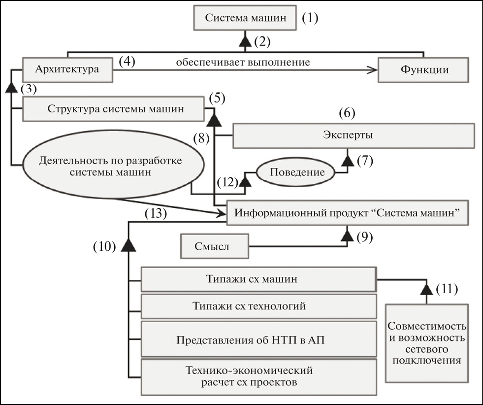 Система машин является физическим объектом (1). Система машин характеризуется (обладает) Функциями и Архитектурой (2). Архитектура характеризуется (обладает) Структурой системы машин и Деятельностью по разработке системы машин (3). Архитектура обеспечивает выполнение Функций (4). Структура системы машин состоит из Экспертов и Информационного продукта «Система машин» (5). Эксперты являются физическим объектом (6). Эксперты характеризуются (обладают) Поведением (7). Эксперты осуществляют Деятельность по разработке системы машин (8). Информационный продукт «Система машин» характеризуется (обладает) Смыслом (9). Информационный продукт «Система машин» состоит из Типажей сельскохозяйственных машин, Типажей сельскохозяйственных технологий, Представлений об НТП в АПК и Технико-экономического расчета сельскохозяйственного проекта (10). Типажи сельскохозяйственных машин характеризуются (обладают) Совместимостью и возможностью сетевого подключения и по меньшей мере еще одной характеристикой (11). Деятельность по разработке системы машин – это Поведение (12). Деятельность по разработке системы машин приводит к созданию Информационного продукта «Система машин» (13).