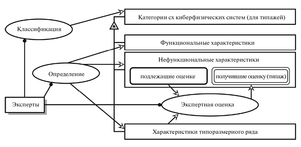 В основе разработанной концептуальной схемы лежат следующие положения. Для разработки типажей машин эксперты выполняют три процесса применительно к данным киберфизическим системам: 1) классификация; 2) определение характеристик технических средств (функциональных, нефункциональных, типоразмерного ряда); 3) экспертная оценка их нефункциональных характеристик с учетом характеристик типоразмерного ряда, в результате которой формируется типаж соответствующей категории машин.