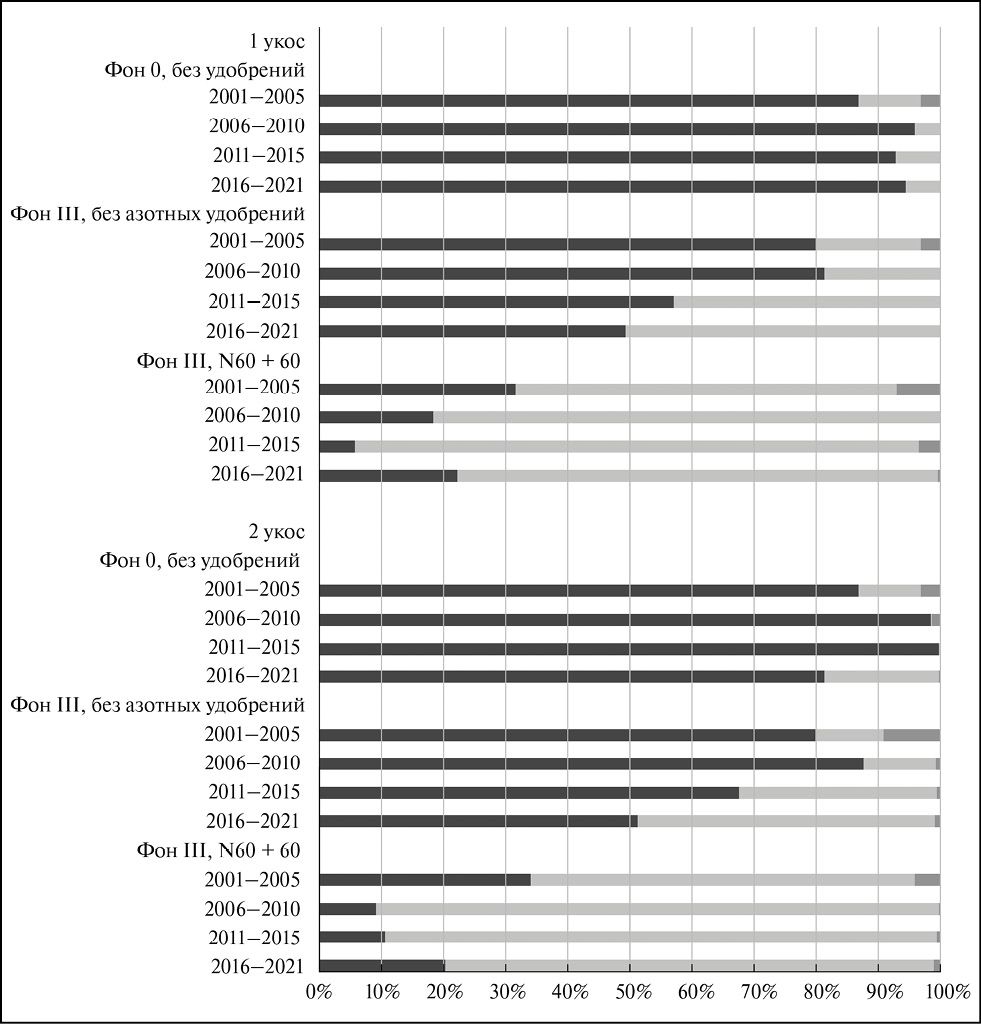 В дальнейшем сорные виды в травостое практически отсутствовали вследствие высокой фитоценотической активности обеих многолетних культур, в среднем по агроценозу их масса не превышала 1 %. Доля сеяных трав в значительной степени зависела от условий минерального питания. В варианте без удобрений преобладал бобовый компонент, в максимально удобренном варианте на фоне с повышенным и высоким содержанием фосфора и внесении N60 под каждый из двух укосов доля костреца в 2006‒2010 гг. составляла соответственно 96 и 82 %, в 2011‒2015 гг. – 93 и 91 %, в 2016‒2021 гг. – 95 и 77 % (рис. 2).
