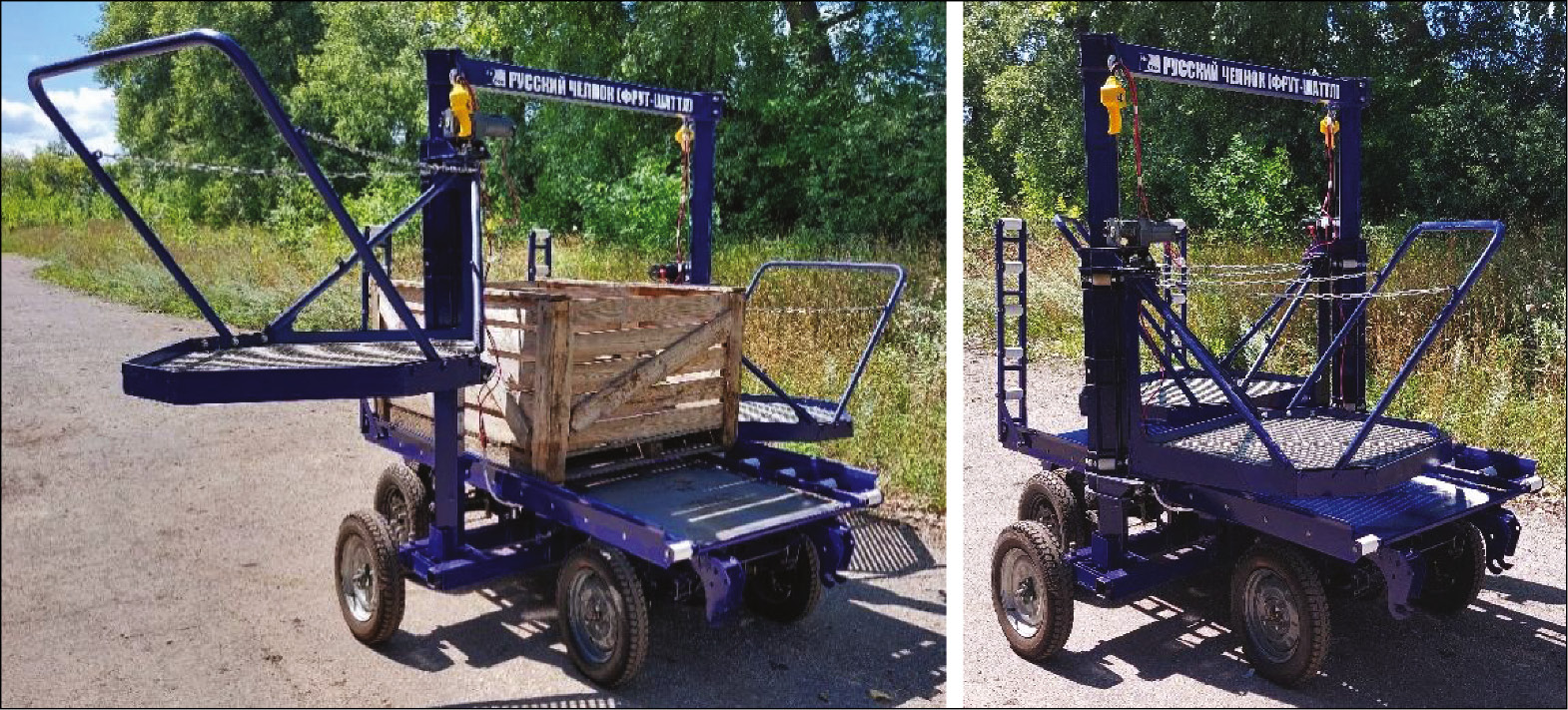 Концепция и принципы «бестракторного земледелия» позволяют оперативно и с минимальными финансовыми затратами обеспечить потребное количество машин и орудий для самых различных условий и технологий, что определяет это направление как «межотраслевую сквозную технологию». Примером практической реализации отдельных элементов «бестракторного земледелия» может служить действующий макет-демонстратор садового е-Дрона с пилотным названием «Русский челнок», созданный в Инжиниринговом центре ИнТех ФГБОУ ВО Мичуринского государственного аграрного университета (рис. 5). Это изделие с грузоподъемностью до 1000 кг и рабочей скоростью от 0 до 30 км/ч предназначено для сбора и транспортировки плодов. Отличительная особенность садового е-Дрона «Русский челнок» – использование 2 электроприводных мостов массового производства мощностью 1,2 кВт, что значительно снижает его стоимость (в 10 раз) по сравнению с существующими зарубежными самоходными садовыми платформами (в России такие платформы не производят).
