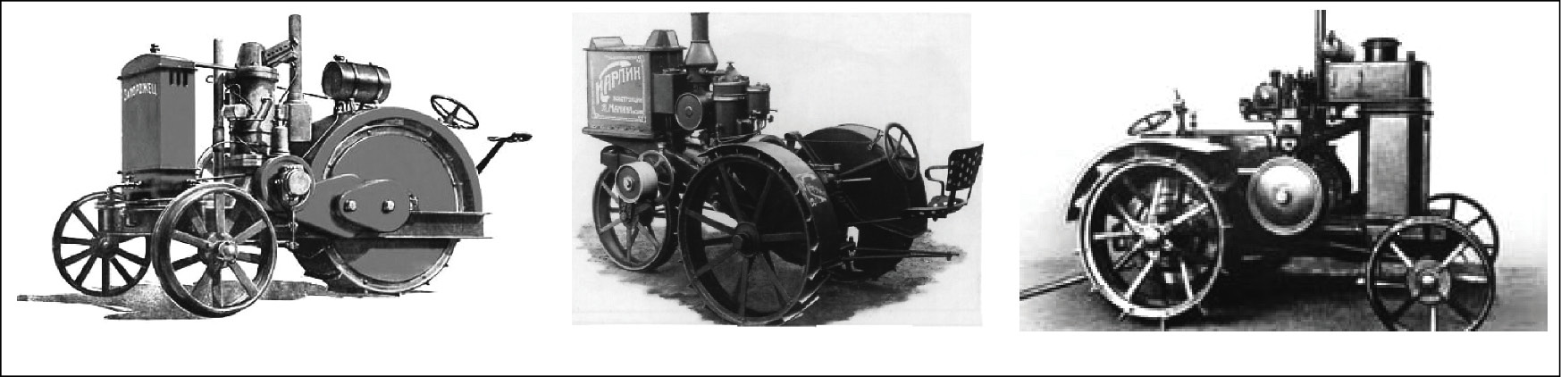 Необходимо отметить, что самобытные тракторы наших производителей были максимально просты в конструктивном плане и выпускались единичыми партиями. Их производство носило полукустарный характер. Объяснялось это послевоенной разрухой, когда значительная часть предприятий не работала, инженерных кадров катастрофически не хватало, а снабжение металлом и необходимыми комплектующими было затруднительным. Поэтому те немногочисленные заводы, которые в условиях НЭПа отважились производить нужную для села тяговую технику, производили ее из того, что было на предприятиях. Так появились тракторы «Запорожец» из Токмака, «Карлик» из Марксштадта, «Коломенец-1» из Подмосковной Коломны (рис. 1).