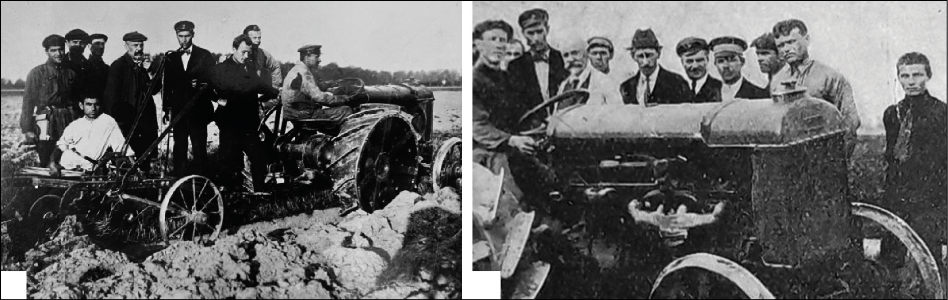 На первом снимке – профессор Василий Прохорович Горячкин (стоит четвертый слева), рядом с ним (стоит пятый слева) предположительно начальник Тракторной технической конторы завода «Красный Путиловец» Иван Лаврентьевич Седов. На втором снимке профессор Павел Михайлович Белянчиков (стоит пятым справа), здесь же предположительно и И. Л. Седов (второй справа).