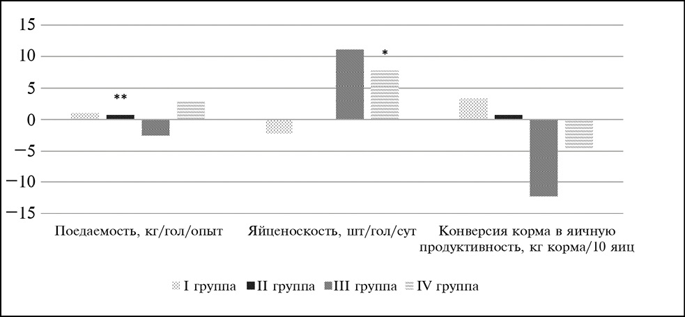 Рис. 1. Разница в зоотехнических показателях кур-несушек опытных групп по сравнению с контрольной (ось X – показатели контрольной группы, %).