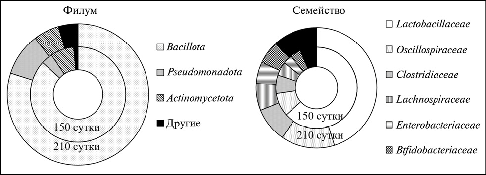 В нашем эксперименте на 210-е сутки, по сравнению со 150-ми сутками, при внесении Дигестарома на фоне снижения численности бактерий семейства Lactobacillaceae отмечено увеличение численности представителей семейства Bifidobacteriaceae, Lachnospiraceae, Ruminococcaceae. Известно, что добавки растительных экстрактов, к которым относится и препарат Дигестаром, улучшают показатели роста, усвояемость питательных веществ, эффективность корма и состояние микробиома кишечника домашней птицы, в том числе благодаря изменению качественного и количественного состава микробиоты желудочно-кишечного тракта [45].