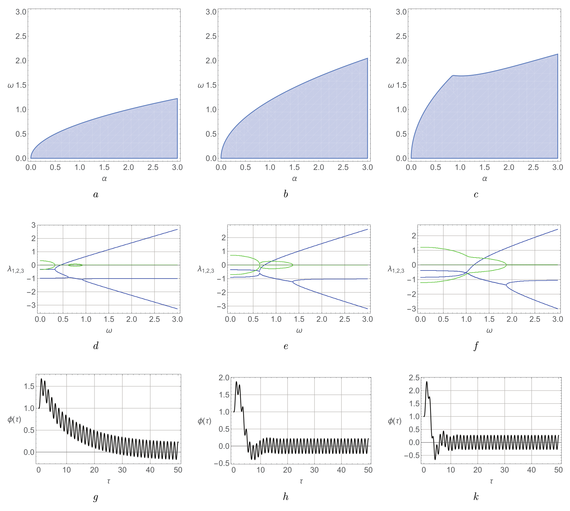Рис. 1.2. Результаты численных расчетов области устойчивости (1.22), корней характеристического уравнения и решения (1.22) при γ = 0,2, α = 0,4. Параметры и начальные условия для угла отклонения ω = 0,4, d = 1,0, Ω = 5,0, φ(0) = 1.0, ψ(0) = 0.0, v(0) = 1.0: a — область устойчивости для σ = 0,05; b — область устойчивости для σ = 0,5; с — область устойчивости для σ = 1,5; d — вещественные (толстые линии) и мнимые части (тонкие линии) корней характеристического уравнения для σ = 0,05; e — вещественные (толстые линии) и мнимые части (тонкие линии) корней характеристического уравнения для σ = 0,5; f — вещественные (толстые линии) и мнимые части (тонкие линии) корней характеристического уравнения для σ = 1,5; g — угол отклонения маятника для σ = 0,05; h — угол отклонения маятника для σ = 0,5; k — угол отклонения маятника для σ = 1,5