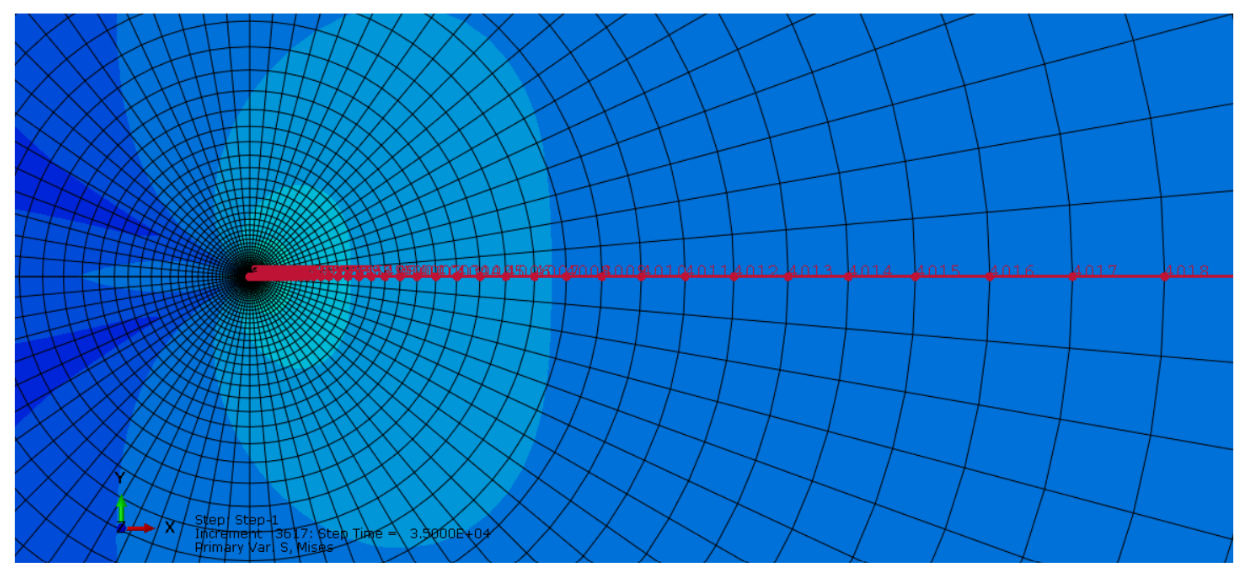 Сетка в окрестности вершины трещины построена с использованием сингулярных конечных элементов. Концентрические окружности поделены на три области: перед вершиной дуга окружности величиной 180 MathType@MTEF@5@5@+= feaahqart1ev3aaatCvAUfeBSjuyZL2yd9gzLbvyNv2CaerbuLwBLn hiov2DGi1BTfMBaeXatLxBI9gBaerbd9wDYLwzYbItLDharqqtubsr 4rNCHbGeaGqiVu0Je9sqqrpepC0xbbL8F4rqqrFfpeea0xe9Lq=Jc9 vqaqpepm0xbba9pwe9Q8fs0=yqaqpepae9pg0FirpepeKkFr0xfr=x fr=xb9adbaqaaeGaciGaaiaabeqaamaabaabaaGcbaGaaGymaiaaiI dacaaIWaWaaWbaaSqabeaacqWIyiYBaaaaaa@3991@  разбита на 36 секторов, таким образом, раствор секторального элемента равен 5 MathType@MTEF@5@5@+= feaahqart1ev3aaatCvAUfeBSjuyZL2yd9gzLbvyNv2CaerbuLwBLn hiov2DGi1BTfMBaeXatLxBI9gBaerbd9wDYLwzYbItLDharqqtubsr 4rNCHbGeaGqiVu0Je9sqqrpepC0xbbL8F4rqqrFfpeea0xe9Lq=Jc9 vqaqpepm0xbba9pwe9Q8fs0=yqaqpepae9pg0FirpepeKkFr0xfr=x fr=xb9adbaqaaeGaciGaaiaabeqaamaabaabaaGcbaGaaGynamaaCa aaleqabaGaeSigI8gaaaaa@3819@ , две другие части поделены на 17 секторов. Тип элементов сетки был избран CPS4. Полученная конечно-элементная сетка представлена на рис. 4.