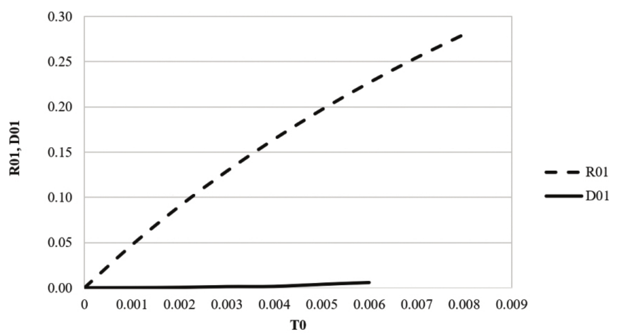 Сравнительный анализ зависимостей двух введенных критериев от безразмерного объема закачки для скважины 2447 приведен на рис. 2. Эти зависимости показывают, что разница между коэффициентами Дикстры Парсонса до и после воздействия изменяется в небольшом интервале от нуля до 0,004, в то время как разница среднеквадратичных отклонений составляет от нуля до 0,28.