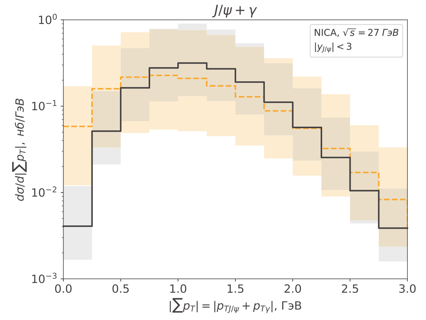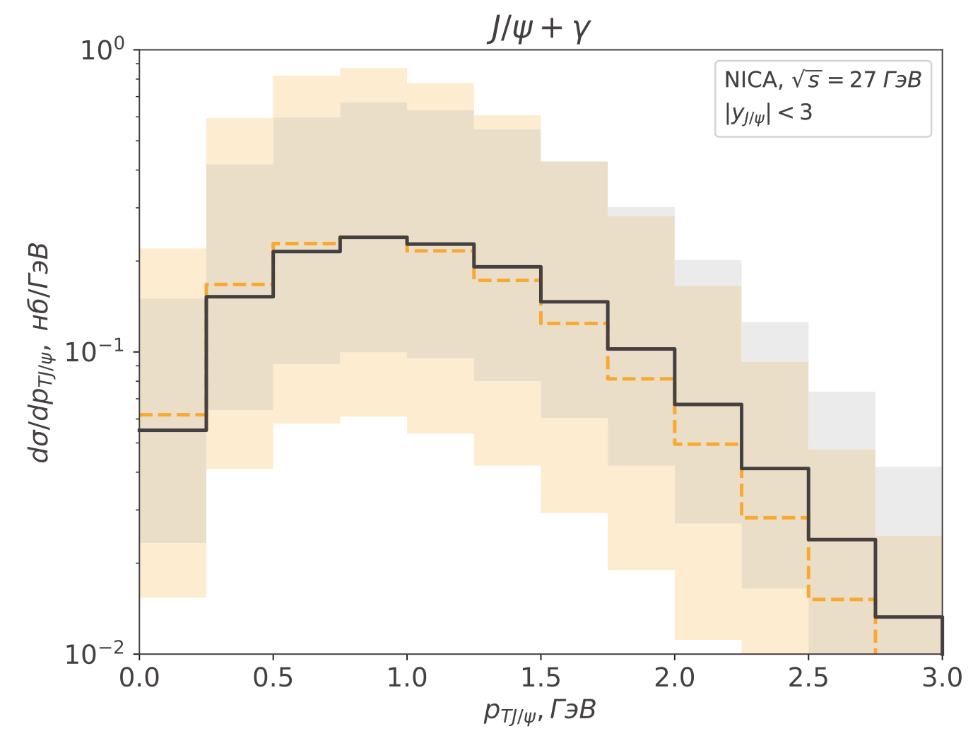 При энергиях коллайдера NICA проведен расчет дифференциальных сечений ассоциативного рождения J/ψ - мезонов и прямых фотонов в ОПМ и в рамках моделей адронизации МЦС и МИЦ. Параметры моделей были фиксированы из сравнения с экспериментальными данными по спектрам прямых J/ψ -мезонов при энергиях экспериментов PHENIX [42] и NA3 [43]. Рассчитанные спектры для ассоциативного рождения J/ψ+γ слабо зависят от выбора модели адронизации, МЦС или МИЦ. Основная погрешность теоретических расчетов, как это обычно наблюдается в расчетах в ЛП по константе сильного взаимодействия, обусловлена неопределенностью в выборе жесткого масштаба и может достигать 100 %. Однако предсказываемые нами величины сечения ассоциативного рождения J/ψ+γ при энергии эксперимента SPD NICA достаточно велики, что позволяет надеяться на возможность их экспериментального измерения, т. к. рождения прямых J/ψ -мезонов и прямых фотонов характеризуются по отдельности достаточными для выделения сигнала отношениями "сигнал-фон". Анализ этого отношения в случае совместного рождения J/ψ+γ требует специального исследования, которое планируется сделать в будущем.