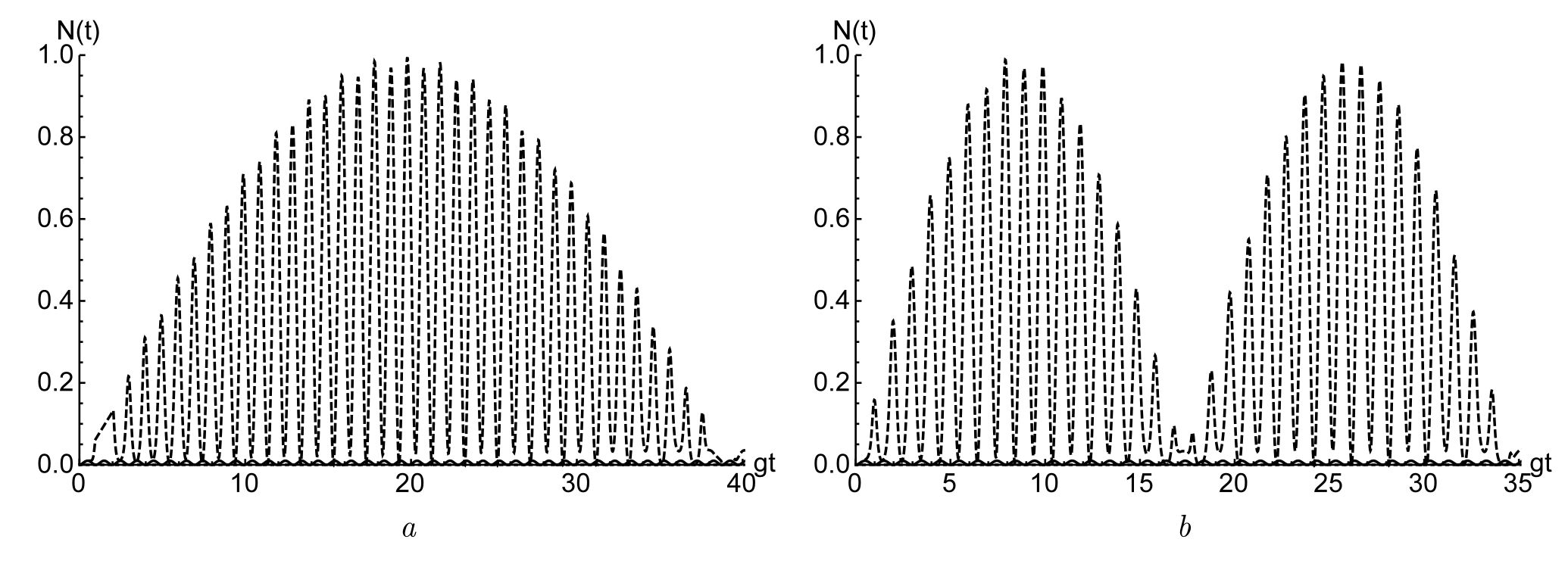Fig. 1. The negative dependence N(t) on the time gt for the initial state of qubits |+; −⟩. Number of photons in mode n = 2. Mode of nonlinearities χ = μ = 0 (solid line) and χ = 0:1; μ = 0 (dashed line) ( a) and χ = μ = 0 (solid line) and χ = 0; μ = 0,1 (dashed line) ( b)