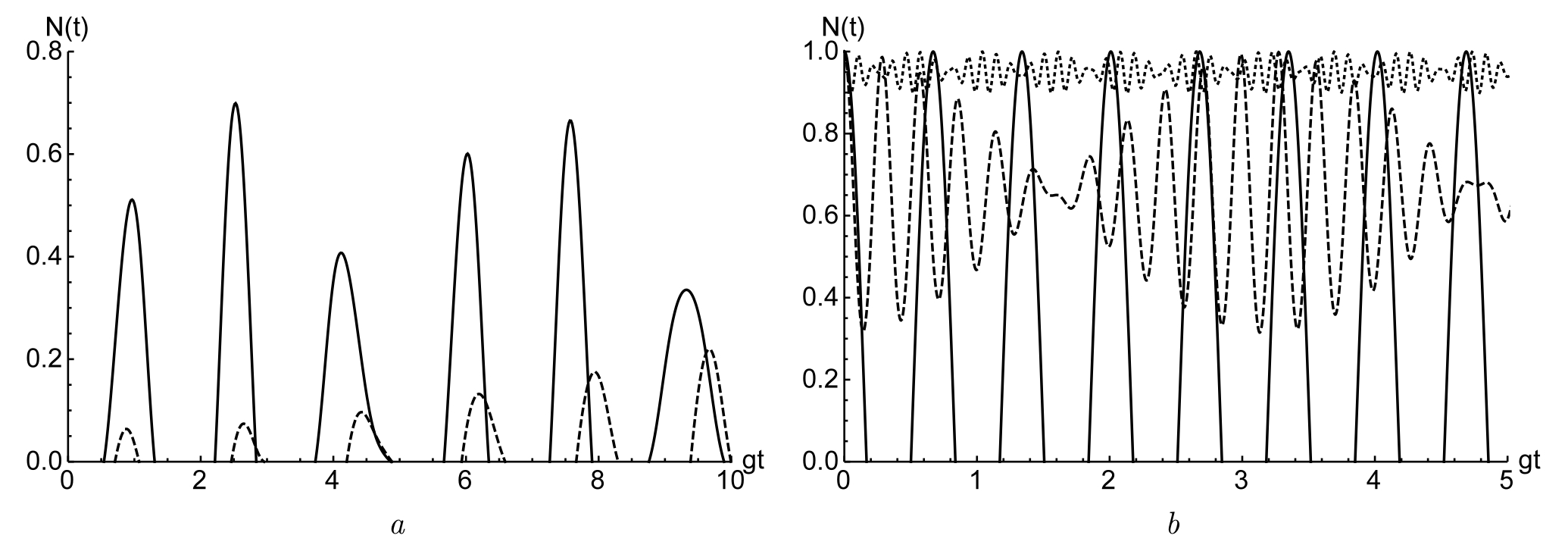 Рис. 2: Зависимость отрицательностей N(t) от приведенного времени gt для начального состояния кубитов |+; +⟩ (а) и перепутанного состояния 1/√2(|+; -⟩ +|-, +⟩ (b). Число фотонов в моде n = 2 (a) и n = 10 (b). Значения нелинейностей ꭓ = 1, μ = 0 (сплошная линия) и ꭓ = 0, μ = 0.5 (штриховая линия) ( a) и ꭓ = μ = 0 (сплошная линия), ꭓ = 1, μ = 0 (штриховая линия) и ꭓ = 0, μ = 0.2 (точечная линия)