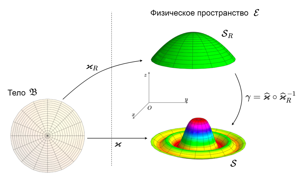 Проиллюстрируем геометрические идеи на частном примере, основанном на решении задачи об осесимметричной конечной деформации гиперупругой мембраны [49]. Рисунок 2 содержит некоторые результаты численных расчетов с использованием этого решения. Тело B MathType@MTEF@5@5@+= feaahqart1ev3aaatCvAUfeBSjuyZL2yd9gzLbvyNv2CaerbuLwBLn hiov2DGi1BTfMBaeXatLxBI9gBaerbd9wDYLwzYbItLDharqqtubsr 4rNCHbGeaGqiVu0Je9sqqrpepC0xbbL8F4rqqrFfpeea0xe9Lq=Jc9 vqaqpepm0xbba9pwe9Q8fs0=yqaqpepae9pg0FirpepeKkFr0xfr=x fr=xb9adbaqaaeGaciGaaiaabeqaamaabaabaaGcqqaaaaaaaaGqSf 2yRbWdbeaatuuDJXwAKzKCHTgD1jharyqr1ngBPrgigjxyRrxDYbac faWdaiab=fa8cbaa@447C@ изображено в центре нижней части рисунка как открытый диск на евклидовой плоскости с нанесенной на нем координатной сеткой. Этим иллюстрируется, что тело имеет лишь структуру гладкого многообразия и что в рассматриваемом случае эта структура совместна с евклидовой. Физическое пространство, изображенное в правой верхней части рисунка, является двумерным евклидовым многообразием. Оно содержит две плоские евклидовы формы S 1 MathType@MTEF@5@5@+= feaahqart1ev3aaatCvAUfeBSjuyZL2yd9gzLbvyNv2CaerbuLwBLn hiov2DGi1BTfMBaeXatLxBI9gBaerbd9wDYLwzYbItLDharqqtubsr 4rNCHbGeaGqiVu0Je9sqqrpepC0xbbL8F4rqqrFfpeea0xe9Lq=Jc9 vqaqpepm0xbba9pwe9Q8fs0=yqaqpepae9pg0FirpepeKkFr0xfr=x fr=xb9adbaqaaeGaciGaaiaabeqaamaabaabaaGcqqaaaaaaaaGqSf 2yRbWdbeaatuuDJXwAK1uy0HwmaeHbfv3ySLgzG0uy0Hgip5wzaGqb a8aacqWFse=udaWgaaWcbaGaaGymaaqabaaaaa@444F@ и S 2 MathType@MTEF@5@5@+= feaahqart1ev3aaatCvAUfeBSjuyZL2yd9gzLbvyNv2CaerbuLwBLn hiov2DGi1BTfMBaeXatLxBI9gBaerbd9wDYLwzYbItLDharqqtubsr 4rNCHbGeaGqiVu0Je9sqqrpepC0xbbL8F4rqqrFfpeea0xe9Lq=Jc9 vqaqpepm0xbba9pwe9Q8fs0=yqaqpepae9pg0FirpepeKkFr0xfr=x fr=xb9adbaqaaeGaciGaaiaabeqaamaabaabaaGcqqaaaaaaaaGqSf 2yRbWdbeaatuuDJXwAK1uy0HwmaeHbfv3ySLgzG0uy0Hgip5wzaGqb a8aacqWFse=udaWgaaWcbaGaaGOmaaqabaaaaa@4450@ , которые самонапряжены (как и любые другие). Эти формы ощущаются двумерным физическим наблюдателем.