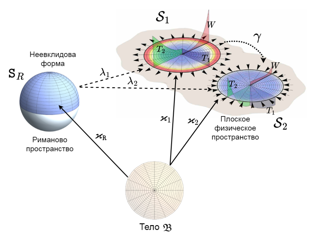 Рассмотренный выбор геометрии на теле соответствует случаю классической механики сплошной среды. В ней тело не играет никакой иной роли, кроме как множества меток, а геометрия на нем фиксирована и совпадает с геометрией любой из его евклидовых форм. Определим теперь неевклидову форму [25; 26]