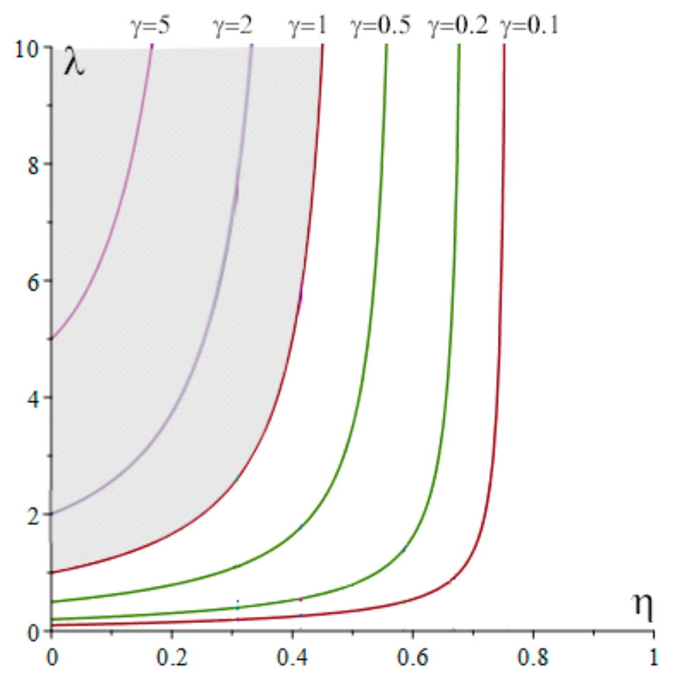 Учитывая положительность параметров, мы получаем зависимость параметров двухслойности γ,η,λ MathType@MTEF@5@5@+= feaahqart1ev3aaatCvAUfeBSjuyZL2yd9gzLbvyNv2CaerbuLwBLn hiov2DGi1BTfMBaeXatLxBI9gBaerbd9wDYLwzYbItLDharqqtubsr 4rNCHbGeaGqiVu0Je9sqqrpepC0xbbL8F4rqqrFfpeea0xe9Lq=Jc9 vqaqpepm0xbba9pwe9Q8fs0=yqaqpepae9pg0FirpepeKkFr0xfr=x fr=xb9adbaqaaeGaciGaaiaabeqaamaabaabaaGcqqaaaaaaaaGqSf 2yRbWdbeaapaGaeq4SdCMaaGilaiabeE7aOjaaiYcacqaH7oaBaaa@3E76@ , при которых максимальное напряжение достигает предела прочности на нижнем крае ранее верхнего слоя, а не нижнего: