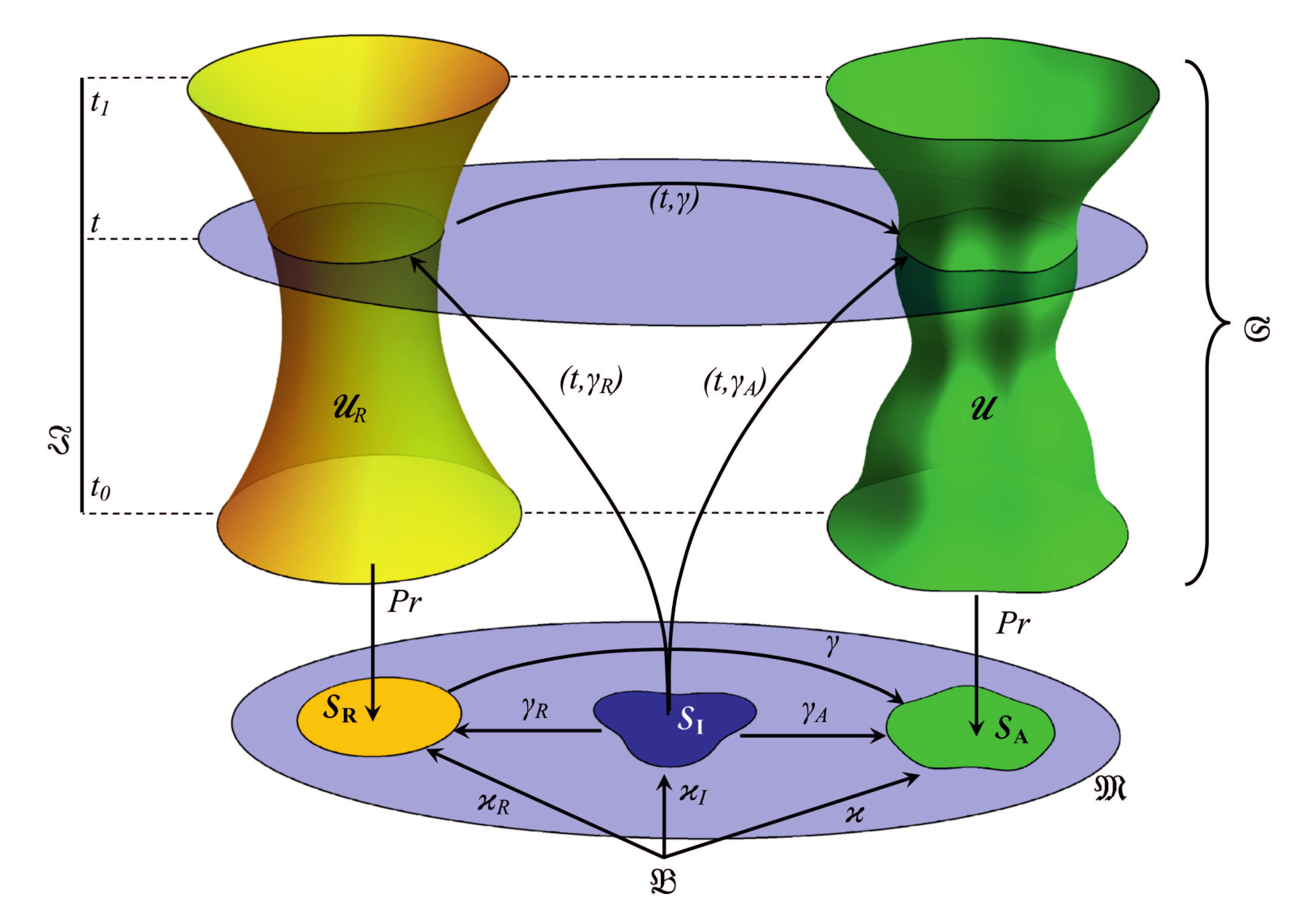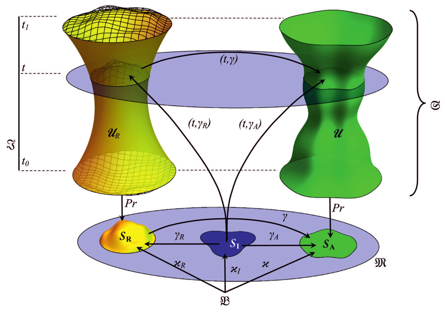 которая представляет все формы как единый геометрический объект. Семейство деформаций , послойно преобразующее сечения двух мировых трубок, определяемых одним и тем же временным слоем, позволяет однозначно восстановить одну из мировых трубок по другой. При этом одна из мировых трубок может быть ассоциирована с отсчетным состоянием, а вторая — с актуальным. Формы, мировые трубки, конфигурации и деформации тела, обладающего ненапряженной формой, иллюстрируются рис. 1. На этом рисунке сечение отсчетной трубки не изменяется во времени. В общем случае изменение сечения отсчетной трубки характеризует эволюцию отсчетного описания. Изменение сечения актуальной трубки характеризует наблюдаемую в физическом пространстве деформацию. Рис. 2 иллюстрирует эту ситуацию.