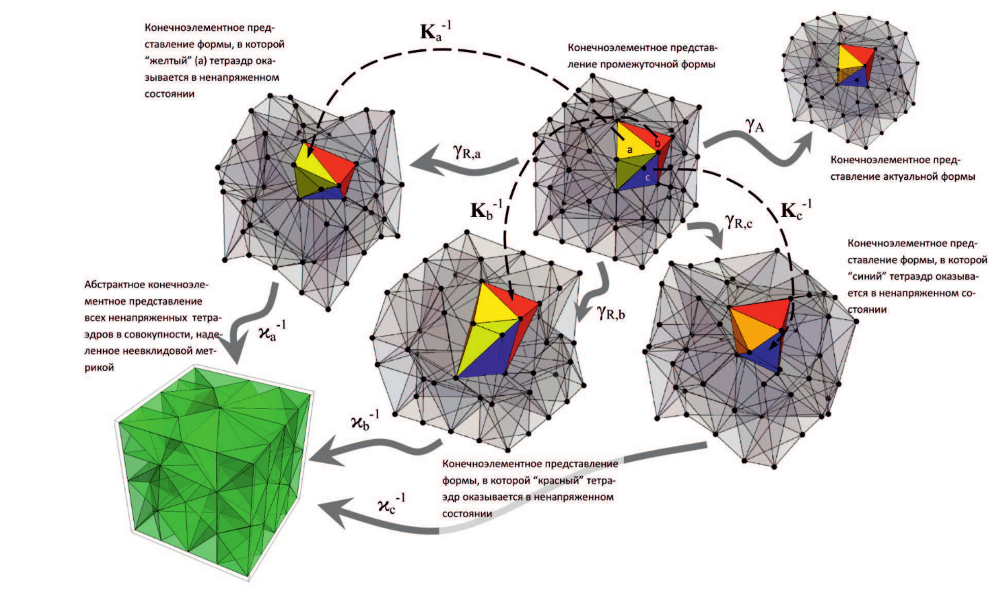 Эта система содержит значения тензорного поля импланта K в качестве параметра. Если положить K=I, то промежуточная форма окажется свободной от напряжений, и решение системы (7) будет определять напряженно-деформированное состояние актуальной формы в смысле классической гиперупругости. Отличие K от единичного тензора характеризует внутренние источники деформаций, роль которых играют распределенные дефекты. В этом случае с каждым абстрактным тетраэдром конечноэлементной модели связаны три его метрических представления: ненапряженный тетраэдр, отсчетный тетраэдр в составе промежуточной формы и актуальный тетраэдр в составе актуальной формы (рис. 5). Все три тетраэдра в отдельности являются регионами физического пространства, и потому для их описания не требуется неевклидовых представлений. Вместе с тем совокупности тетраэдров, образующих конечноэлементные сети, могут быть вложены в физическое (евклидово) пространство только для промежуточной и актуальной форм. Отсчетные тетраэдры в общем случае могут быть вложены в физическое пространство в составе конечноэлементной сети, индивидуальной для каждого из них. В этом состоит аналогия дискретизированного состояния с семейством отсчетных форм (5). Попытка погрузить совокупность отсчетных тетраэдров, не нарушая совпадения узлов, в физическое пространство окажется безуспешной, поскольку длины ребер соседних тетраэдров не будут совпадать в евклидовой метрике. Надлежащая ”подстройка” метрики (6) над многообразием, получаемым из аффинного пространства за счет ” стирания” метрики ассоциированного с ним трансляционного евклидова пространства, приводит к построению риманового пространства, в которое все ненапряженные тетраэдры вкладываются в совокупности без разрывов конечноэлементной сети.