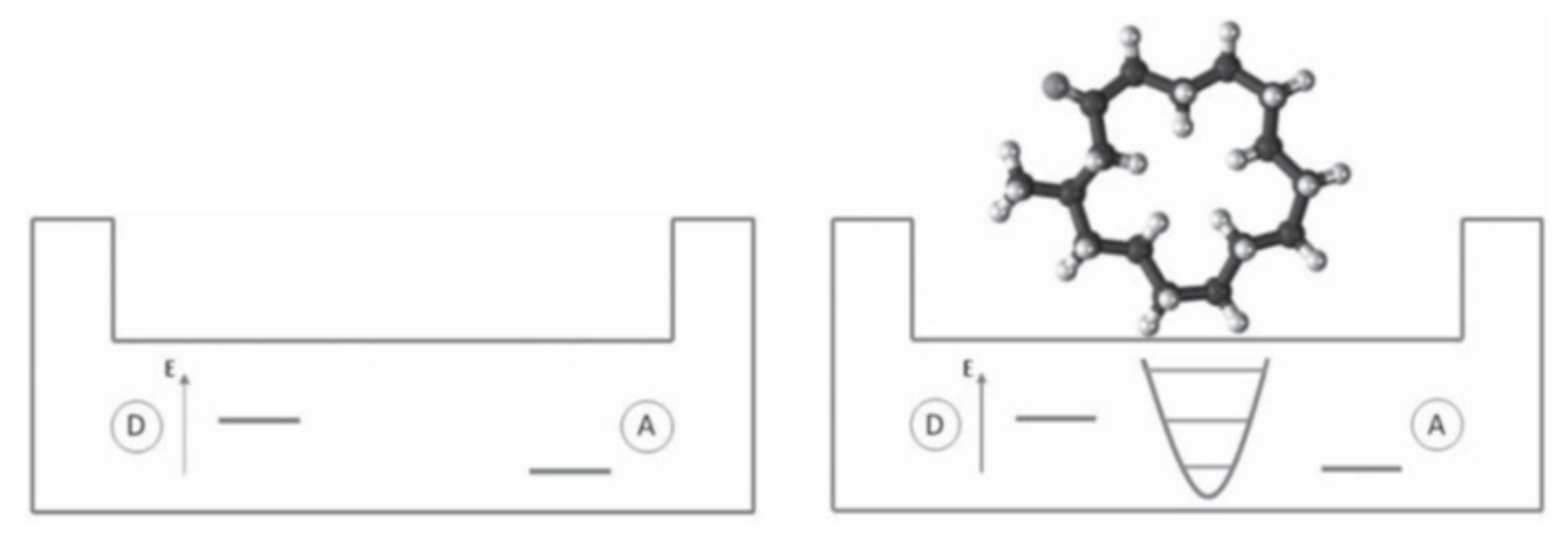 Такой механизм основан на физических свойствах молекул, а не на химических признаках или идеях формы, лежащих в основе принципа «замок-ключ». Еще в 1938 г. известный физик Дайсон предположил, что запах молекулы можно определить по ее колебательному спектру, и, следовательно, обонятельная система эффективно действует как колебательный спектрометр. Отметим, что для обозначения квантов колебаний молекулы также часто используется синоним “виброн” или “вибронное возбуждение”. Много позже, в 1996 г. Л. Турин выдвинул гипотезу [26], предложив квантовый механизм неупругого туннельного переноса электрона, с помощью которого обонятельная система действительно сможет идентифицировать определенные колебательные режимы одоранта (см. рис. 3.1). Согласно этому механизму, между сопряженными частями рецептора A и D имеются высокий потенциальный барьер для движения электрона и сильное различие электронных уровней по разные стороны барьера. В отсутствие молекулы одоранта в кармане рецептора туннелирование электрона невозможно из-за сильного различия локальных электронных уровней. После присоединения молекулы одоранта в карман рецептора туннелирование электрона становится возможным, если выполняется резонансное условие, а именно энергия вибронного возбуждения одоранта равна разности энергий электрона до и после перехода. Тогда при туннельном переносе электрона с нижнего на верхний уровень квант колебаний молекулы одоранта поглощается или происходит испускание при обратном переходе.