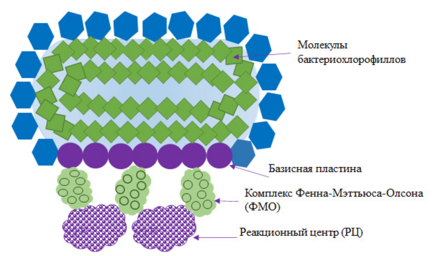Рассмотрим фотосинтезирующую систему (ФС) зеленых серобактерий, схематично изображенную на рис. 3.2. Светособирающий комплекс (” антенна”) в ФС представляет собой заключенную в белково-липидную оболочку самоорганизованный ансамбль молекул бактериохлорофиллов с (BСhl c), поглощающих фотоны в видимой и ультрафиолетовой части спектра. Энергия поглощенного фотона преобразуется в электрон-дырочное возбуждение (экситон Френкеля) молекулы, которое передается следующим молекулам к периферии антенного комплекса, где расположена встроенная в оболочку базисная пластина — паракристаллическая структура, содержащая бактериохлорофилл а (BСhl а). Примыкающий к этой пластине пигментно-белковый комплекс Фенна — Мэттьюса — Олсона (ФMО) действует как канал передачи экситонного возбуждения от базисной пластины антенного комплекса в реакционный центр (РЦ), где оно преобразуется в полезную химическую энергию.