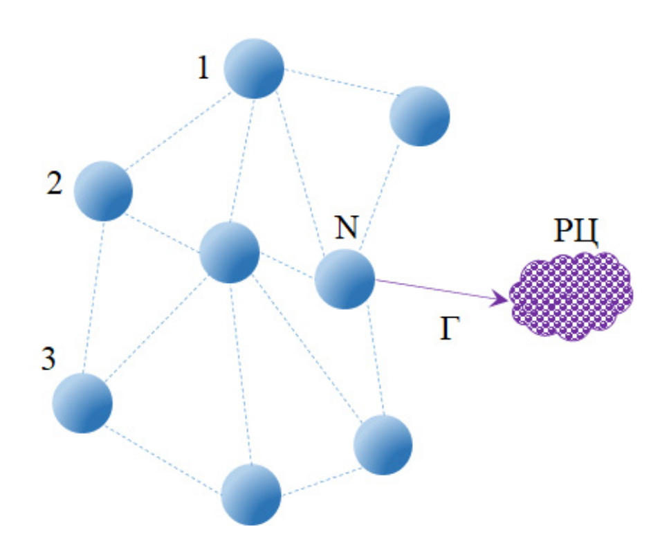 Рис.3.3.: Комплекс ФМО как квантовая транспортная сеть, состоящая из хромофорных узлов i=1,2,...,N. Стрелкой указан канал необратимого перехода экситонного возбуждения из транспортной сети в узел-сток, имитирующий реакционный центр фотосинтезирующего комплекса; скорость такого перехода обозначена как Γ