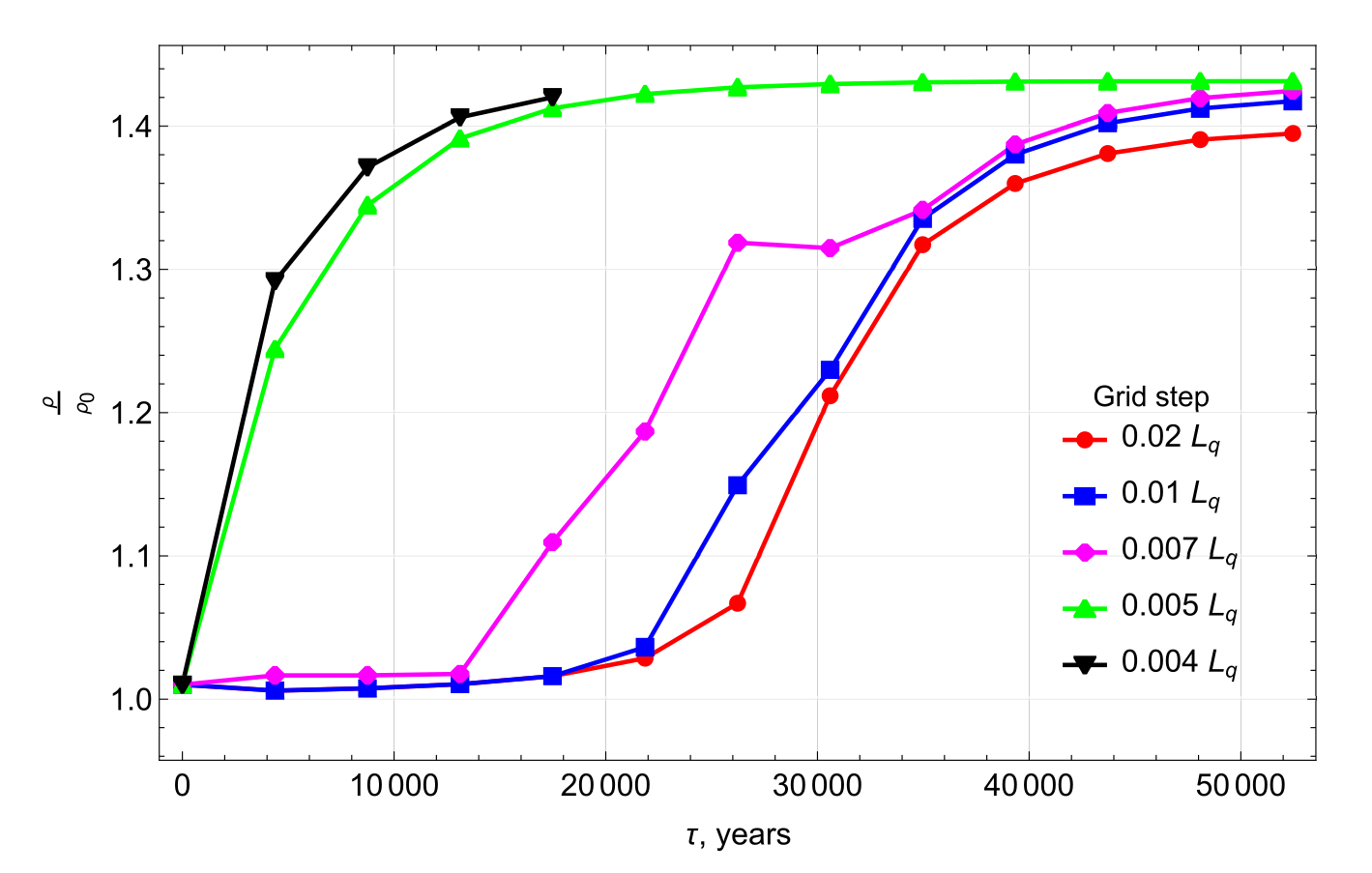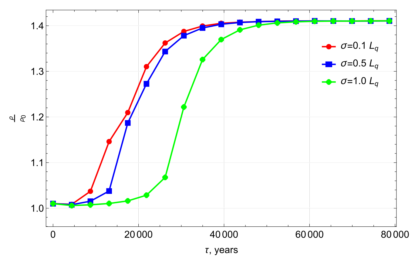 The estimations of instability time for the chosen parameters of the mediums give tinst = 1065 years. Thus, the growth from the half of the amplitude of initial perturbation (since the waves propagate in two opposite directions) to a half of maximum amplitude may take about 4000 years, which agrees well with the results of numerical simulations on the finest grid.