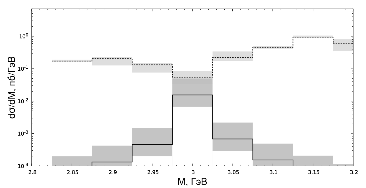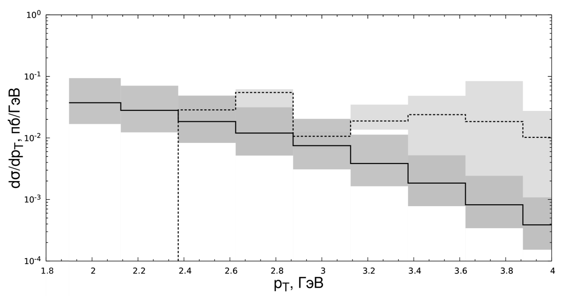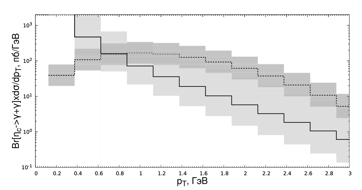 Рис. 4.1. Дифференциальное сечение рождения ηc-мезона как функция поперечного импульса при энергии √s=27 ГэВ, |y|<3, pT<3 ГэВ. Расчет выполнен в МЦС. Сплошная кривая – в ОПМ, пунктирная – в КПМ. Серым выделены области неопределенности расчетов в зависимости от выбора жесткого масштаба