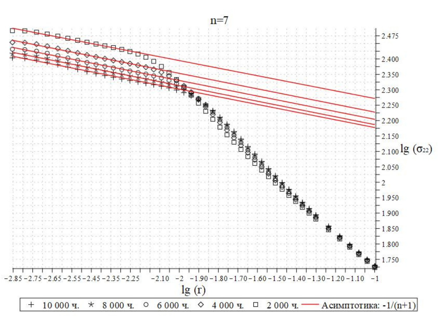 Рис. 3.13. Расчет с учетом эффекта накопления повреждений для n=7: распределение компоненты тензора напряжений σ22 для выбранных расчетных точек. Асимптотика в зоне упругости