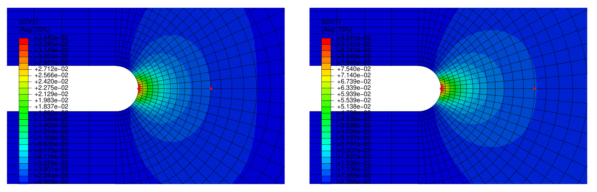 В результате конечно-элементных расчетов можно сделать вывод, что представленные асимптотики для зон ползучести и упругости соответствуют аналитическим решениям. Таким образом, можно сделать заключение, что независимо от формы трещины на расстоянии, характерном протяжению зоны ползучести, строятся асимптотики Хатчинсона — Райса — Розенгрена.