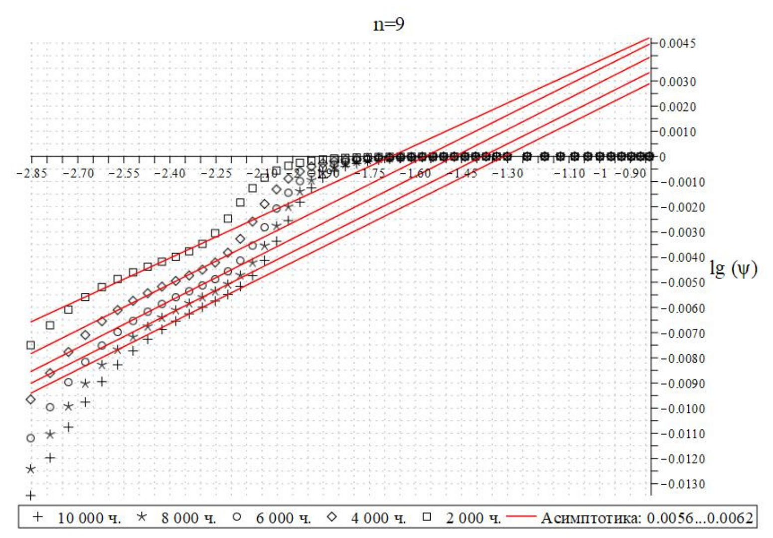 Рис. 3.15. Расчет с учетом эффекта накопления повреждений для n=9: распределение сплошности ψ для выбранных расчетных точек. Асимптотика в зоне I