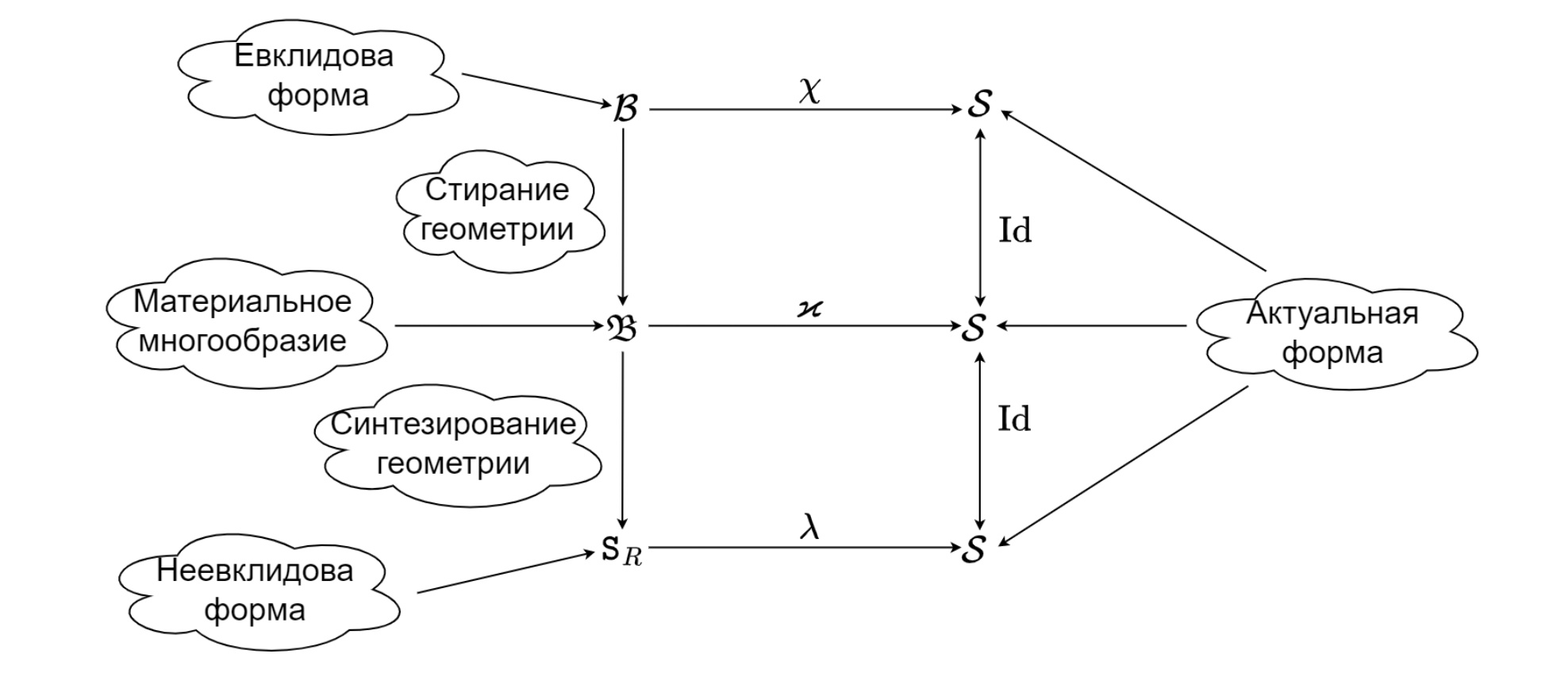 Замечание 3. В настоящей работе используется три вида форм: фиксированная отсчетная форма (2.6), промежуточная форма (2.8) и актуальная форма (2.5). Отсчетная форма служит пространством меток, с помощью которого идентифицируется деформация континуума, а актуальная форма — та, которую занимает тело в текущий момент. Несмотря на то что в рамках классической механики континуума нет необходимости явно выделять промежуточную форму, в работе она используется как вспомогательная форма для синтезирования неевклидовой геометрии частного вида.