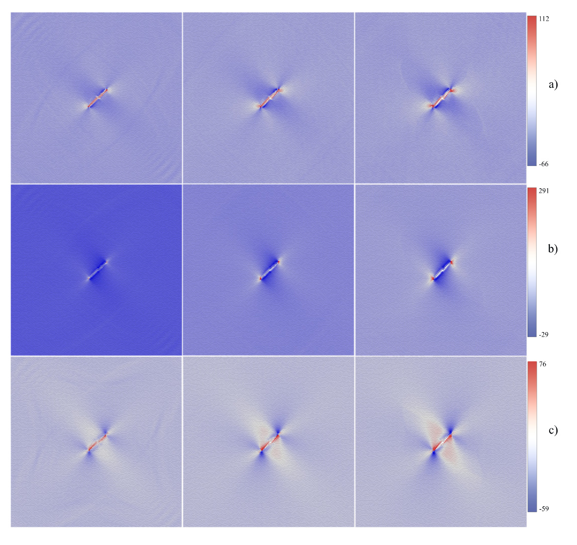 Рис. 1.2. Распределение полей напряжений — a) , — b), — c) на временных шагах 4 пс, 7 пс, 9 пс