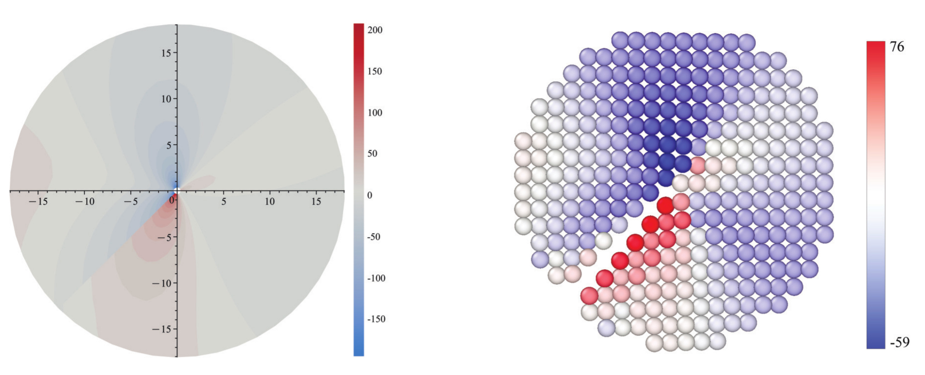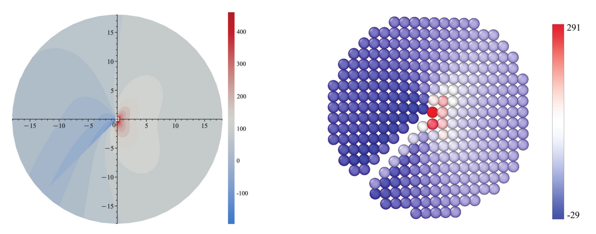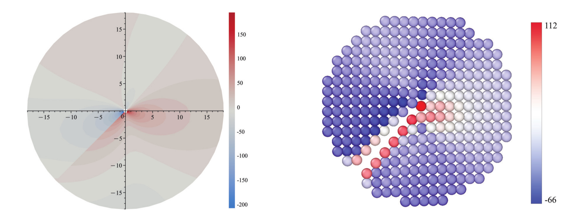 Рис. 3.2. Контурный график, построенный согласно аналитическому решению (слева), и распределение полей напряжений, полученное путем МД-моделирования (справа), для компоненты тензона напряжений