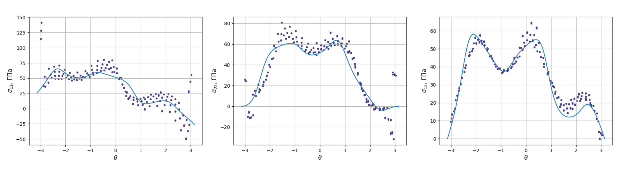 Поскольку кубическая симметрия упругих свойств является частным случаем ортотропной, приведенное решение можно применить к поставленной задаче для определения полей напряжений монокристалла ГЦК-меди. Константы исследуемого материала были получены из тензора упругих модулей в статье [23]. Для сравнения асимптотического решения и результатов МД-моделирования для компонент тезора напряжения , и , полученных аналитически, был выполнен поворот на 45 градусов.