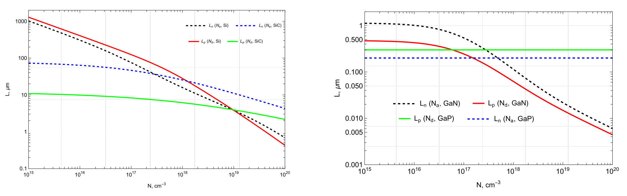 Fig. 1.1. Diffusion lengths of minority charge carriers in semiconductor materials Si, SiC, GaN, GaP