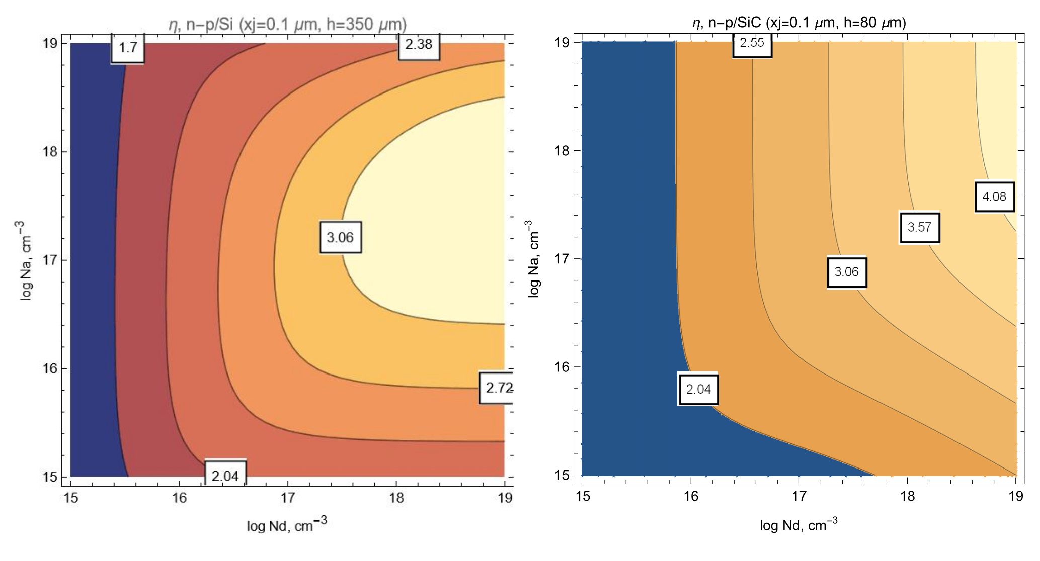 В данной статье мы рассмотрели комплексную многокомпонентную аналитическую модель, которая учитывает фундаментальные физические параметры бетавольтаического элемента на основе тонких гетеропереходов с GaN и GaP на подложках Si и 3С-SiC/Si. Результаты моделирования показали, что в структуре устройства с глубиной перехода 0.1 мкм, коэффициентом заполнения 0.95, умеренными концентрациями легирования и низкими уровнями скоростей поверхностной рекомбинации как в излучателе-эмиттере, так и в подложке-базе, источник с плотностью активности 1100 мКиопределяет хорошую работу бетавольтаического элемента. В частности, типичные электрические параметры элемента можно резюмировать следующим образом: плотность тока короткого замыкания до 200 нА и напряжение открытой цепи до 3.7 В, плотность мощности до 700 нВт и КПД до 25 %. Эффективность преобразования достигает максимального значения при использовании радиоизотопного источника с плотностью активности от 25 до 100 мКи. Полученные результаты могут оказаться очень полезными для оптимизации конструкции бетавольтаических устройств.