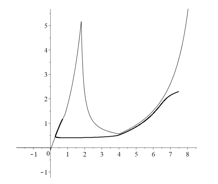 Рис. 2.5: Медленная кривая (тонкая линия) и траектория системы (жирная линия) при начальная точка: