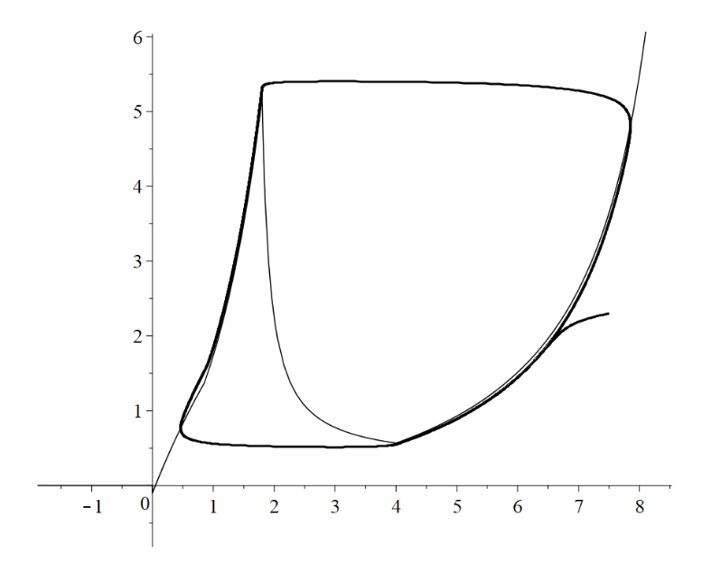 Рис. 2.6: Медленная кривая (тонкая линия) и предельный цикл (жирная линия) при начальная точка: