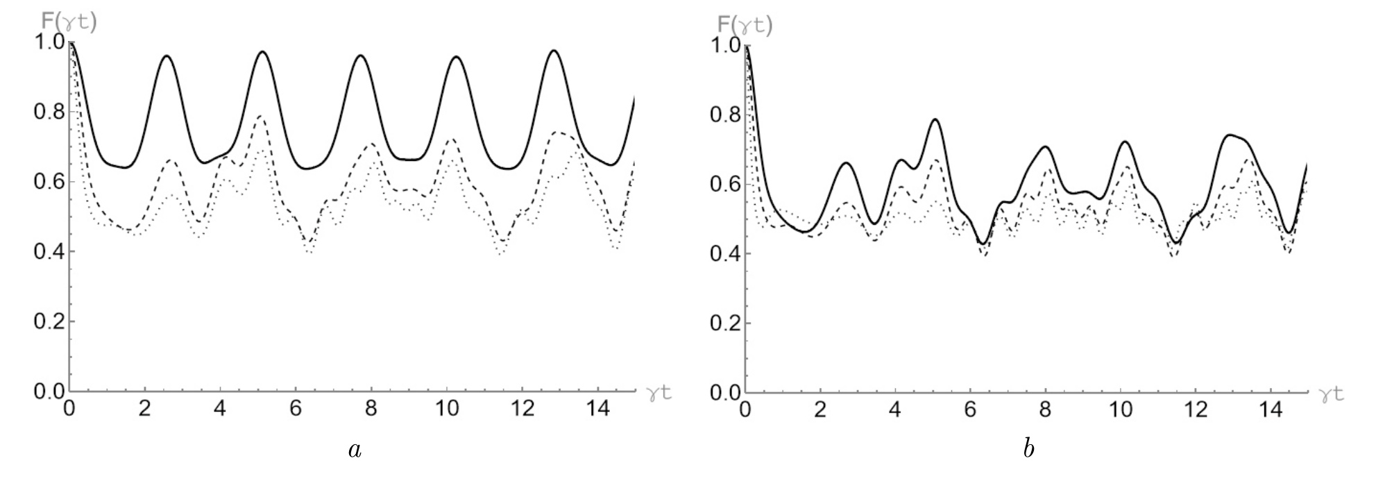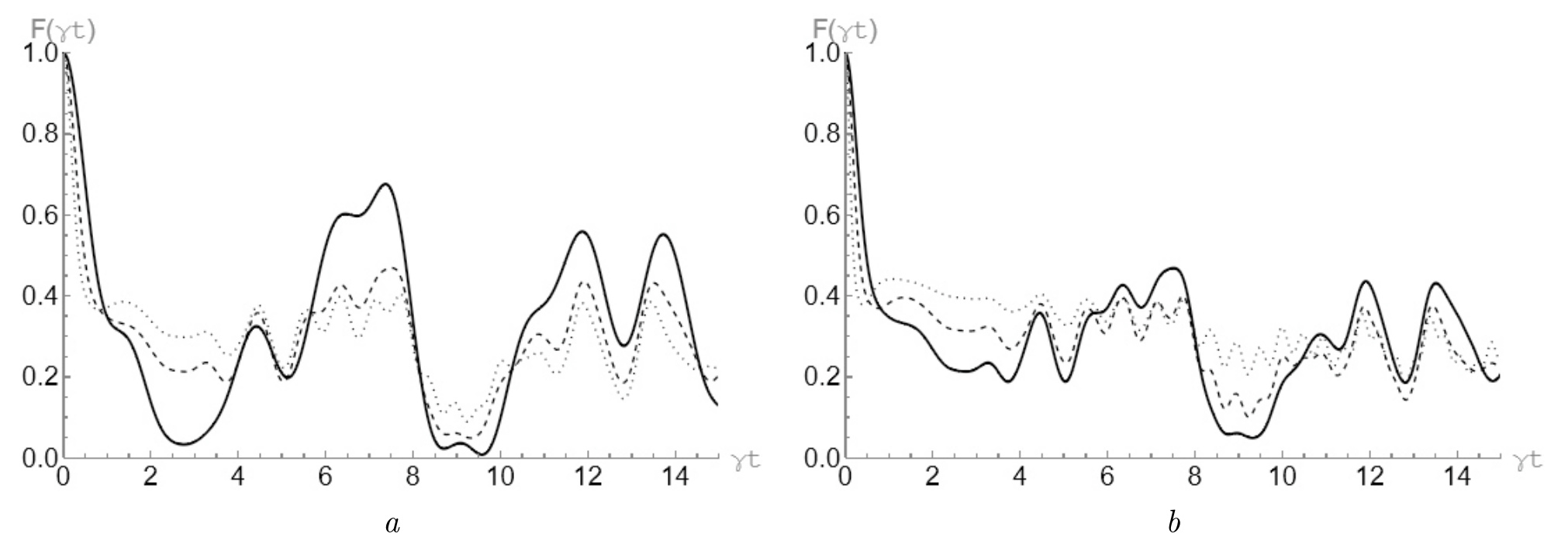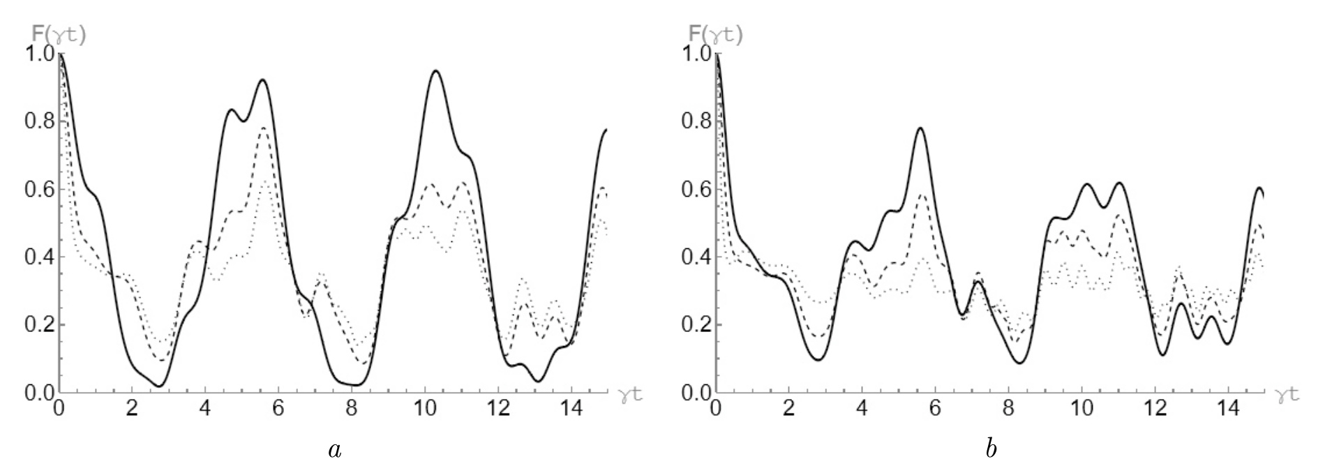 Fig. 1. Graph of the dependence of the fidelity on the reduced time for the initial GHZ state of the form (2) with for various average numbers of thermal photons : (solid line), (dashed line), (dotted line) ( a); (solid line), (dashed line), (dotted line) ( b)