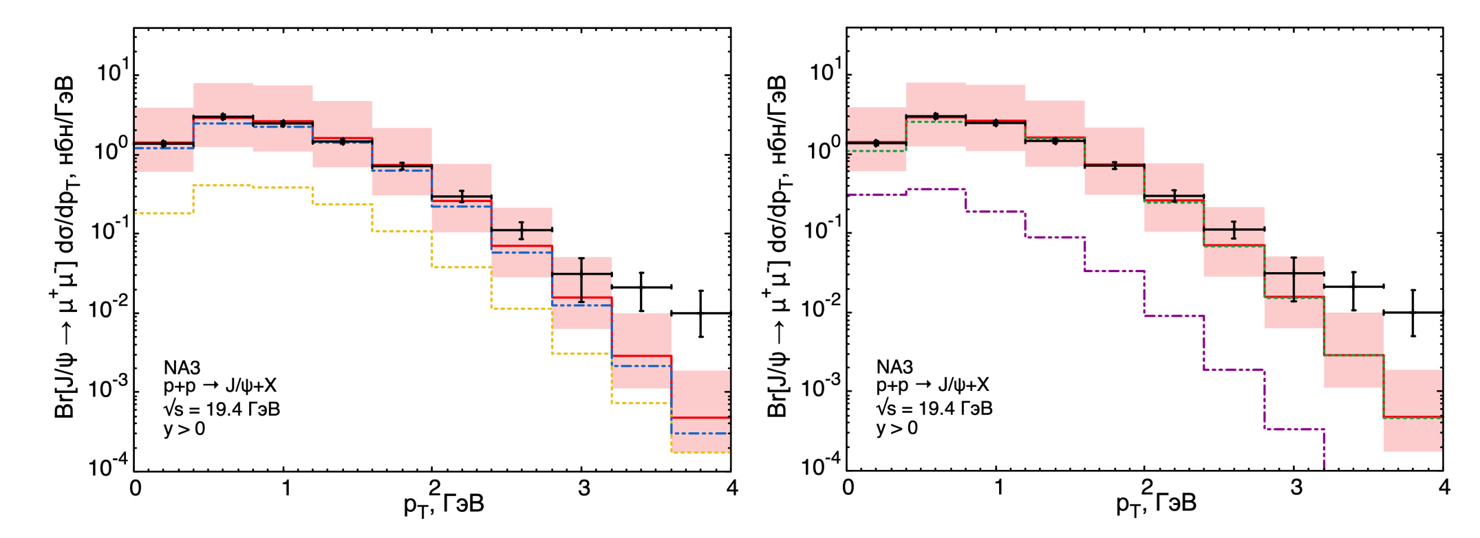Рис. 3.3. Зависимость дифференциального сечения рождения от поперечного импульса чармония в сравнении с экспериментальными данными коллаборации NA3 [28]. Слева показано сравнение полных синглетного (желтая пунктирная линия) и октетного (синяя штрихпунктирная с двумя точками) вкладов в рождение . Справа - сравнение прямого рождения (зеленая пунктирная) и вклада от распадов возбужденных состояний чармония (фиолетовая штрихпунктирная с двумя точками). Красная сплошная линия в обоих случаях отвечает суммарному сечению