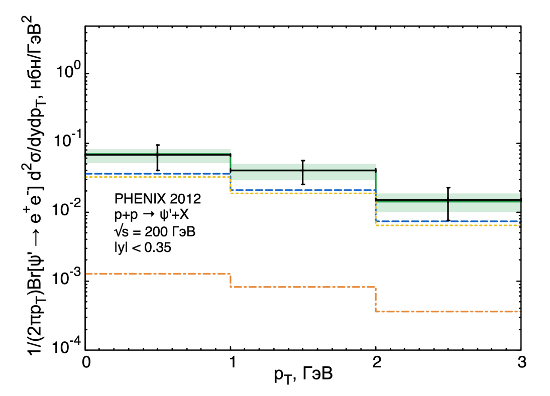 Рис. 3.4. Зависимость дифференциального сечения рождения от поперечного импульса чармония в сравнении с экспериментальными данными коллаборации PHENIX [27]. Показаны вклады от рождения состояний (синяя штриховая линия), (оранжевая штрихпунктирная) и общий не разделяемый фитированием вклад состояний , , (желтая пунктирная). Cумма всех вкладов показана сплошной зеленой линией