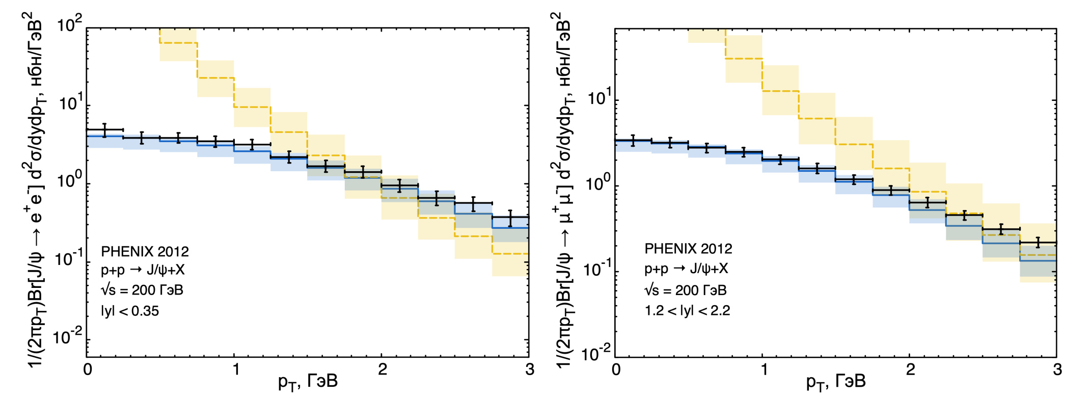 Рис. 3.7. Зависимость дифференциального сечения рождения от поперечного импульса чармония . Расчеты в КПМ (желтая штриховая линия) и ОПМ (синяя сплошная). Экспериментальные данные коллаборации PHENIX [27]