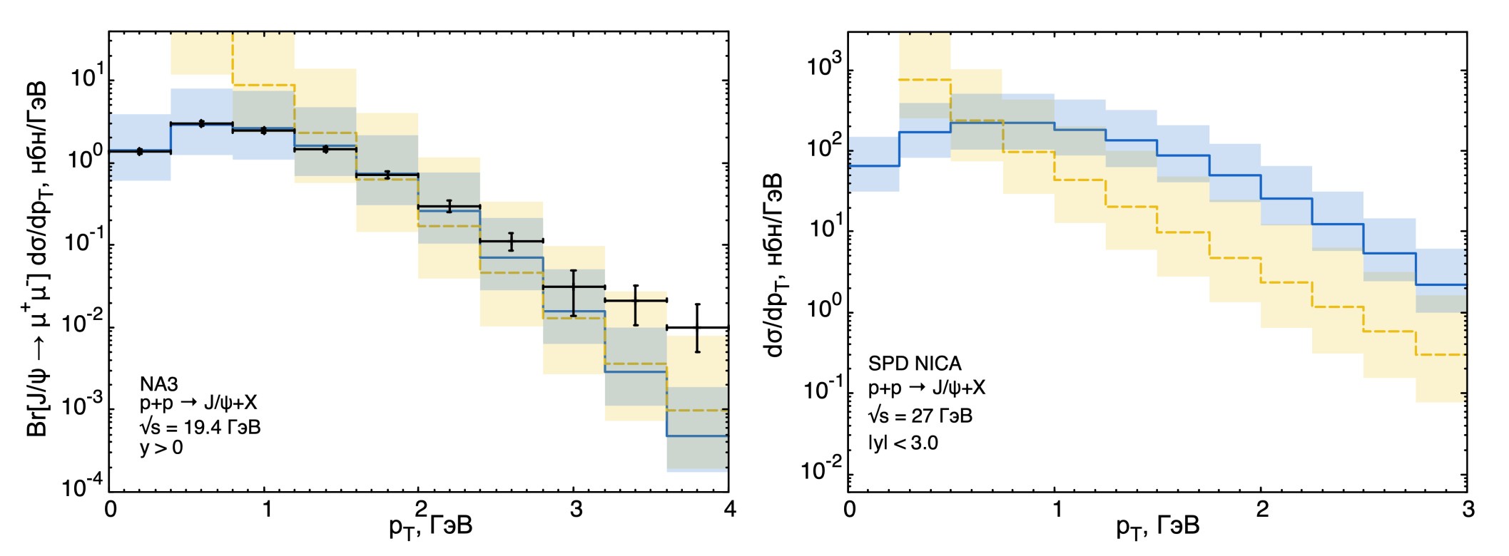 Рис. 3.8. Зависимость дифференциального сечения рождения от поперечного импульса чармония . Расчеты в КПМ (желтая штриховая линия) и ОПМ (синяя сплошная) для экспериментальных данных коллаборации NA3 [28] (слева) и предсказаний для SPD NICA (справа)
