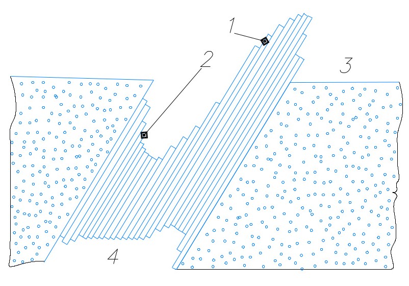 Fig. 1. Scheme of the formation of extrusions (1) and intrusions (2) on the surface (3) of metal materials subjected to cyclic loads; (4) – slip stripes