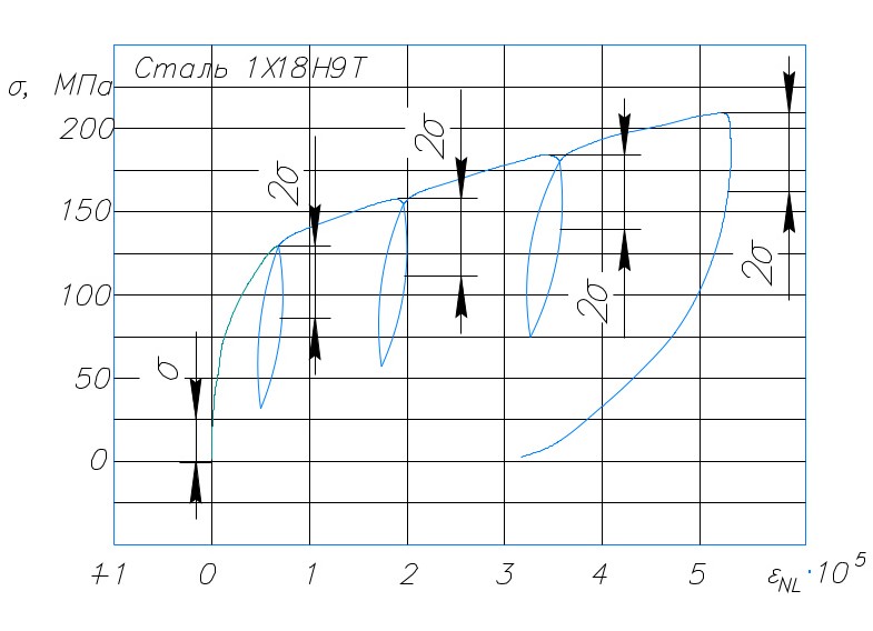 В соответствии с вышеизложенным принимаем, что сталь 1Х18Н9Т является кинематически упрочняющимся материалом, то есть предполагаем, что наряду с жестким смещением предельной поверхности текучести происходит также ее расширение [9].