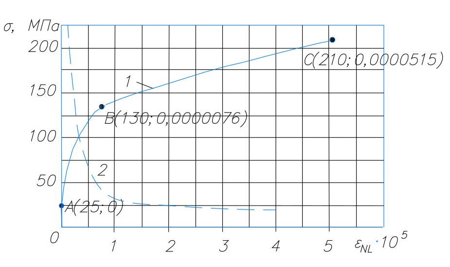 Fig. 3. Strain-stress diagram (1) and the first derivative (2) of the nominal stress with respect to nonlinear strain